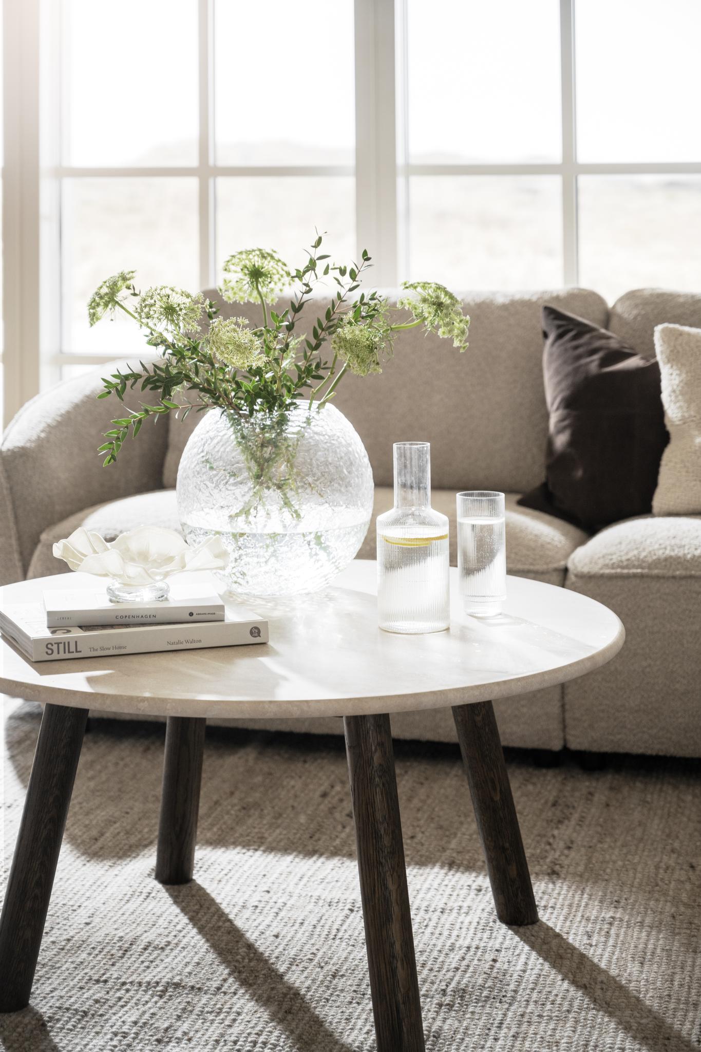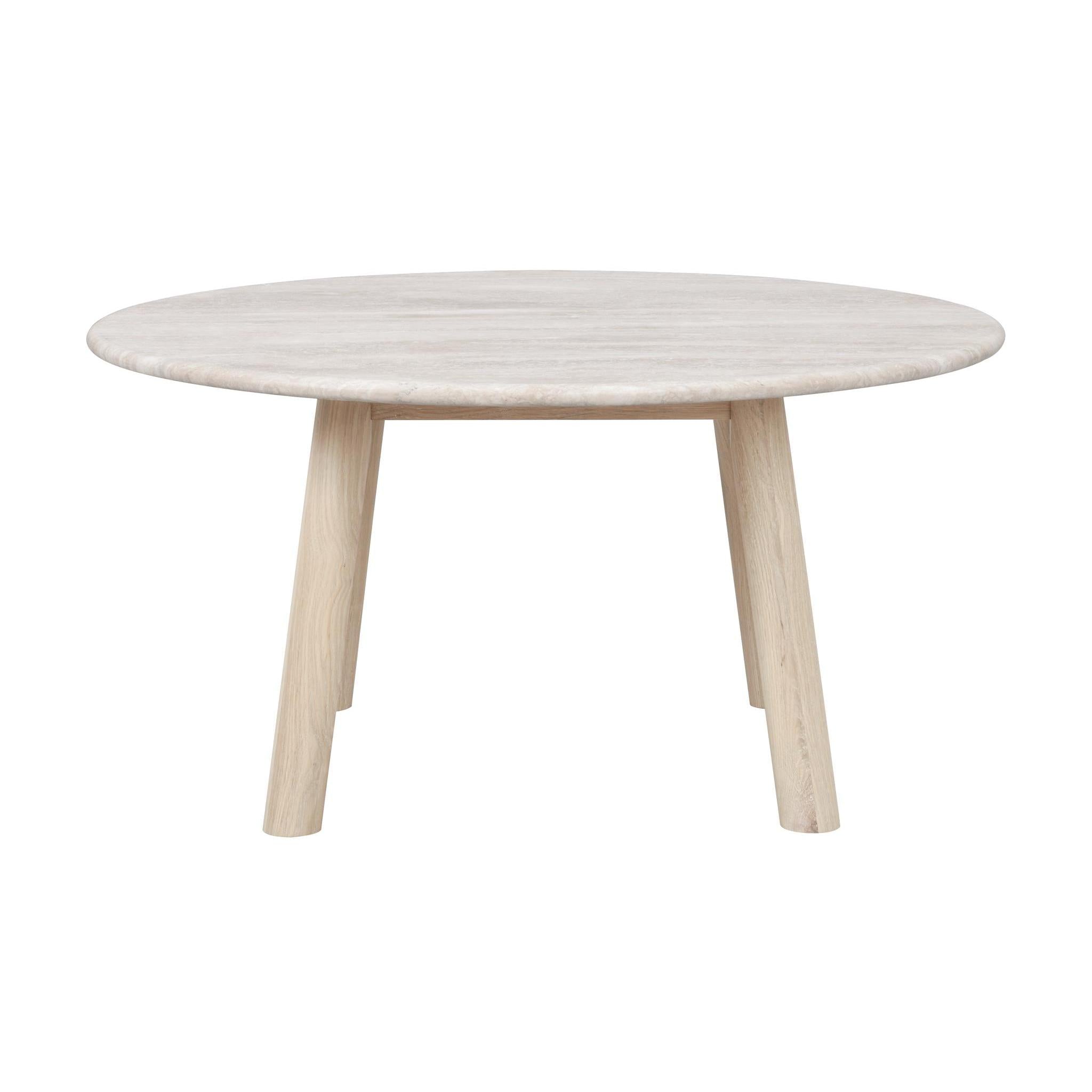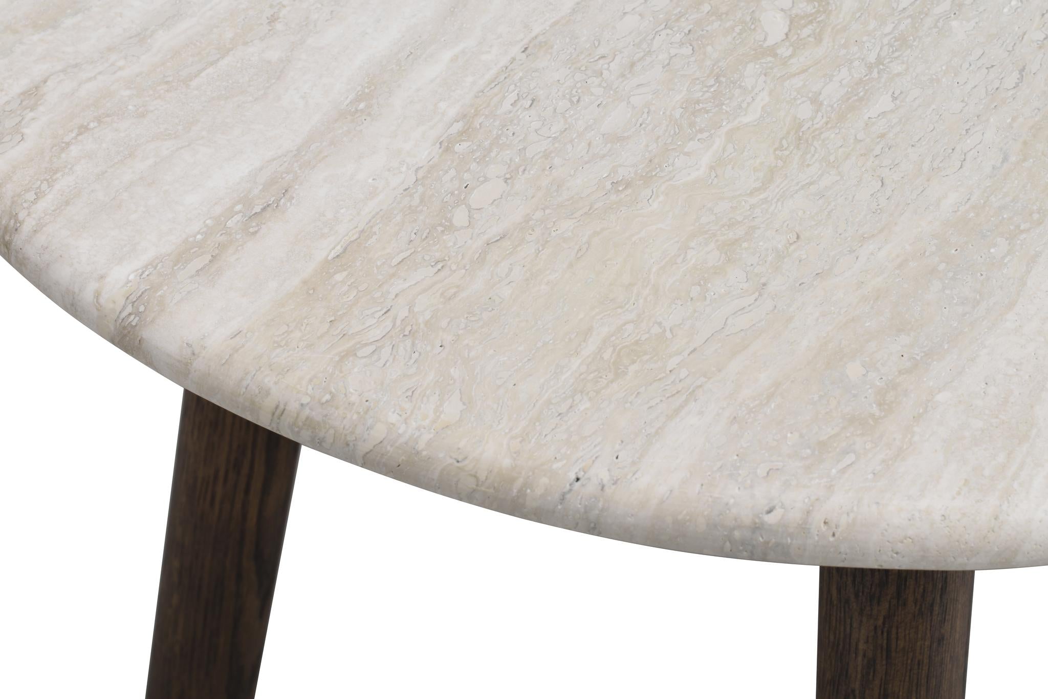 Lyxiga Taransay soffbord Ø90 cm har en exklusiv stenskiva av sandfärgad travertin från Italien och massiva ben av brunlackad FSC-certifierad ek. Travertin är en kalkstenstyp med fina skiftningar som ger soffbordet en naturlig skönhet och med tiden unik patina - där nya detaljer i bordskivan kan upptäckas varje dag. Bordets mjuka runda formspråk skapar en fin kontrast till den livliga och robusta stenskivan. Taransay soffbord finns i två olika storlekar, placera dem separat eller tillsammans som satsbord. Finns i flera utföranden. I kollektionen Taransay ingår även matbord.