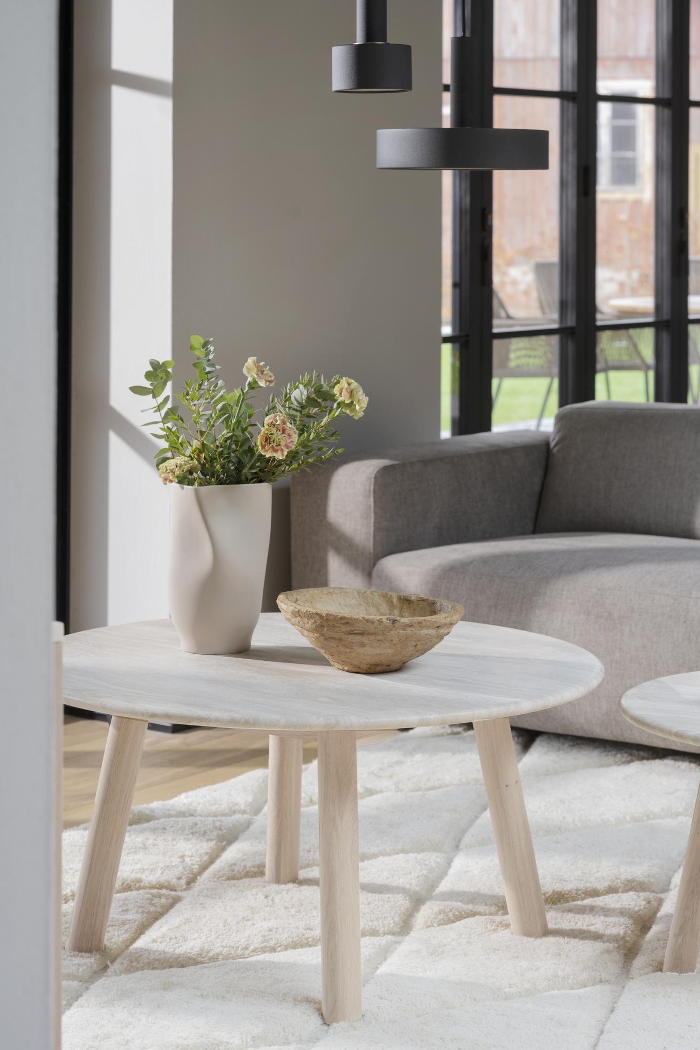 • Ljust soffbord i trä med marmor-topp, dekorerat med vas och skål i modern vardagsrumsmiljö