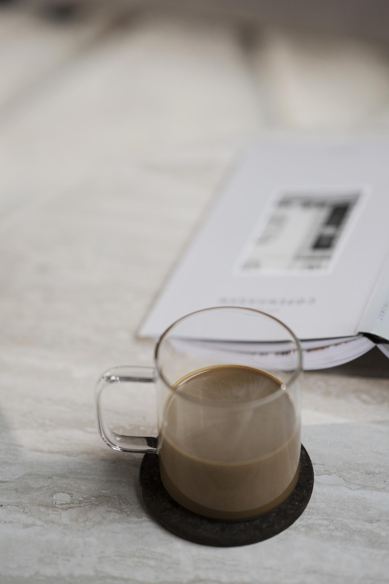 • Glasmugg med handtag och guld-beige gradient, placerad på mörk underlägg med tidning i bakgrunden