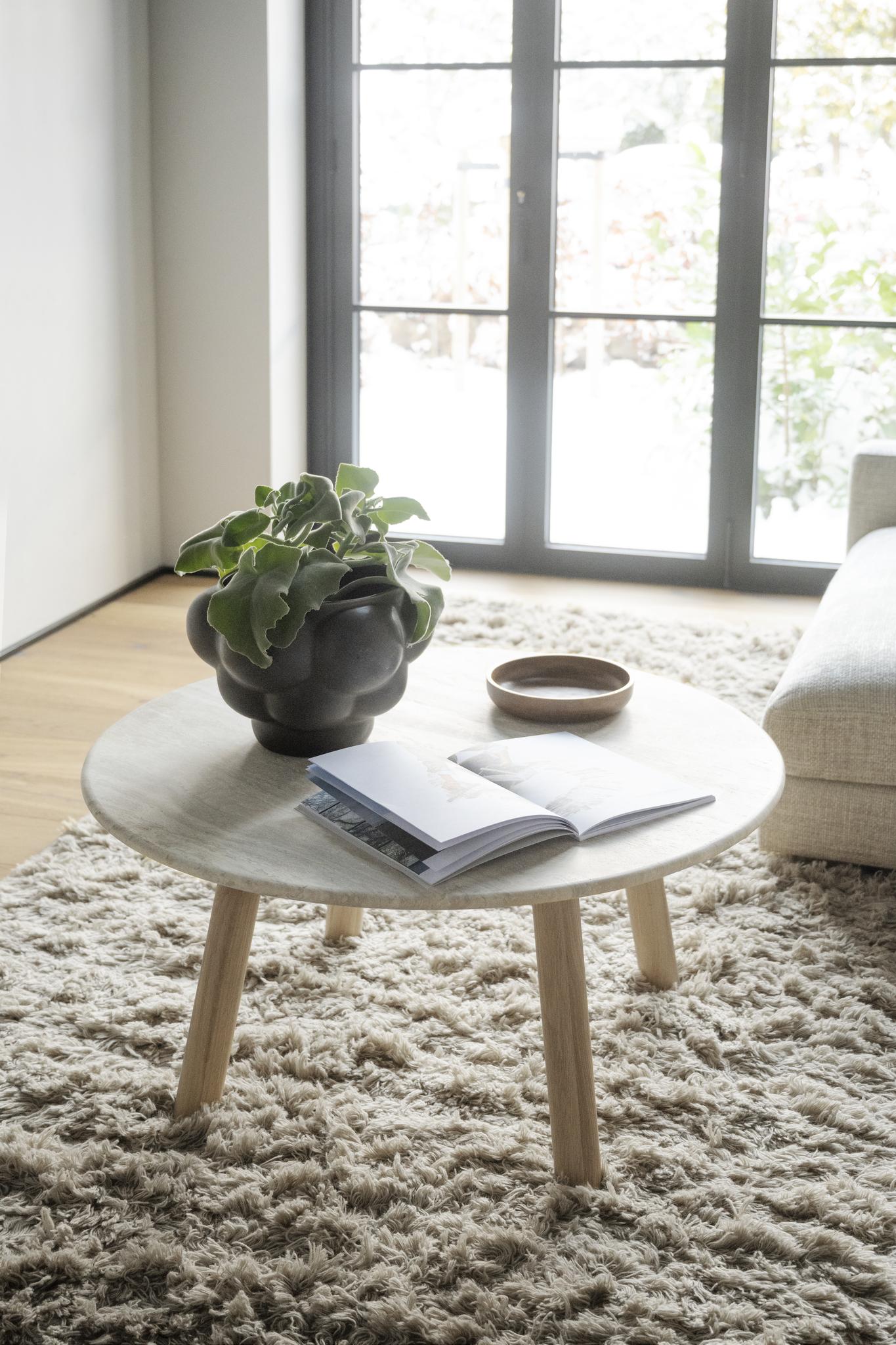 • Runt soffbord i ljust trä med bok, växt och skål på fluffig matta framför fönster