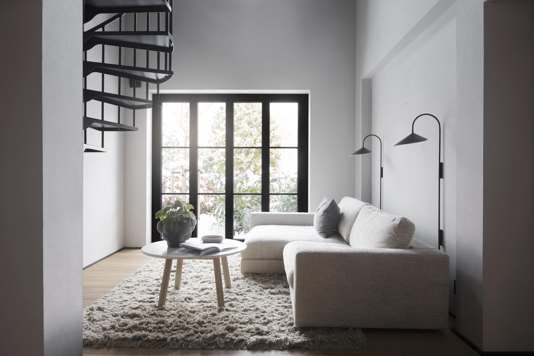 • Grå soffa med ljusa soffbord i modern vardagsrumsmiljö med vit matta och mörkt tak