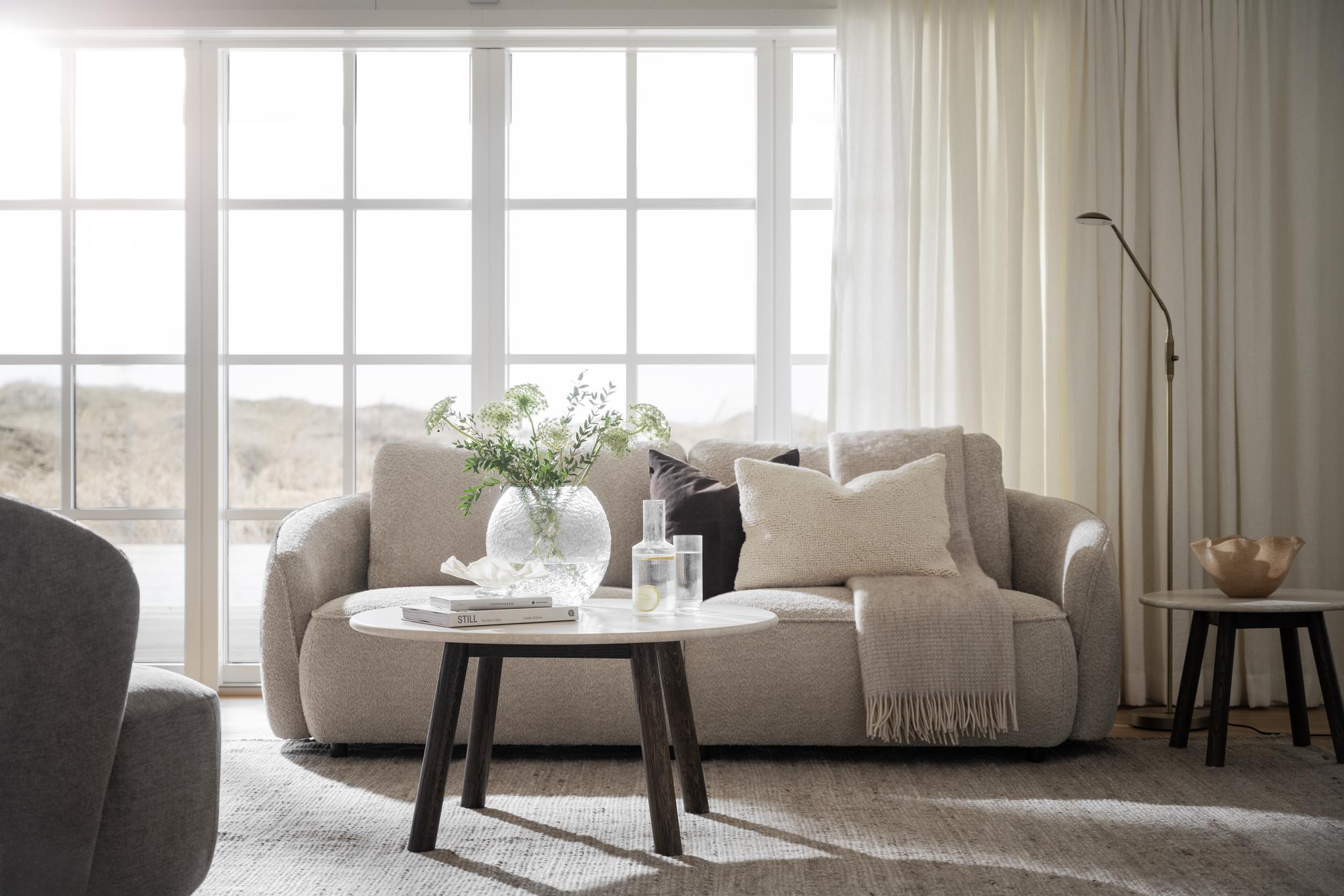 • Beige bouclésofa med kuddar i ljust vardagsrum med runt soffbord och stora fönster med gardiner