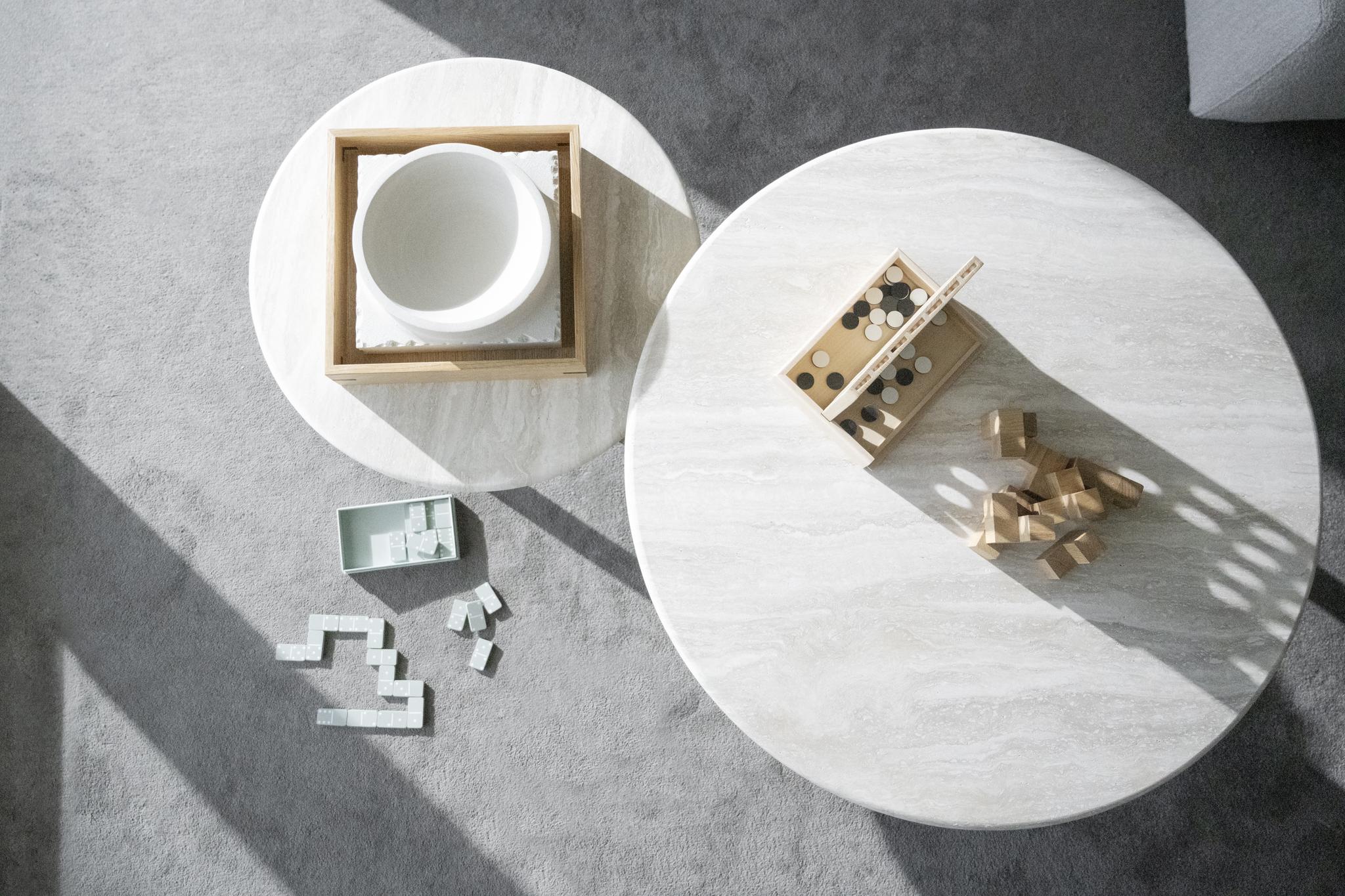 • Runda soffbord i vitt med marmormönster, dekorerade med träask, spel och keramikskål ovanifrån