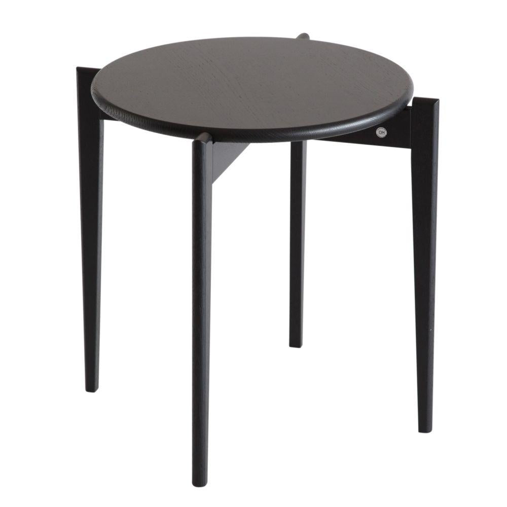 • Runt sidebord i svart med grå träskiva och tre ben i modern skandinavisk design