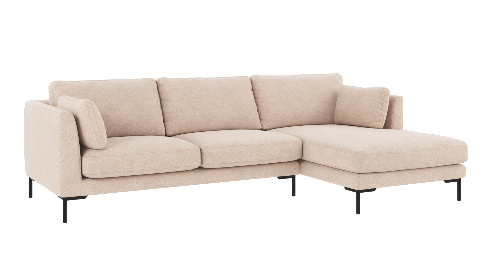 • Beige 3-sits soffa med schäslong och svarta metallben, modern design i ljust tyg
