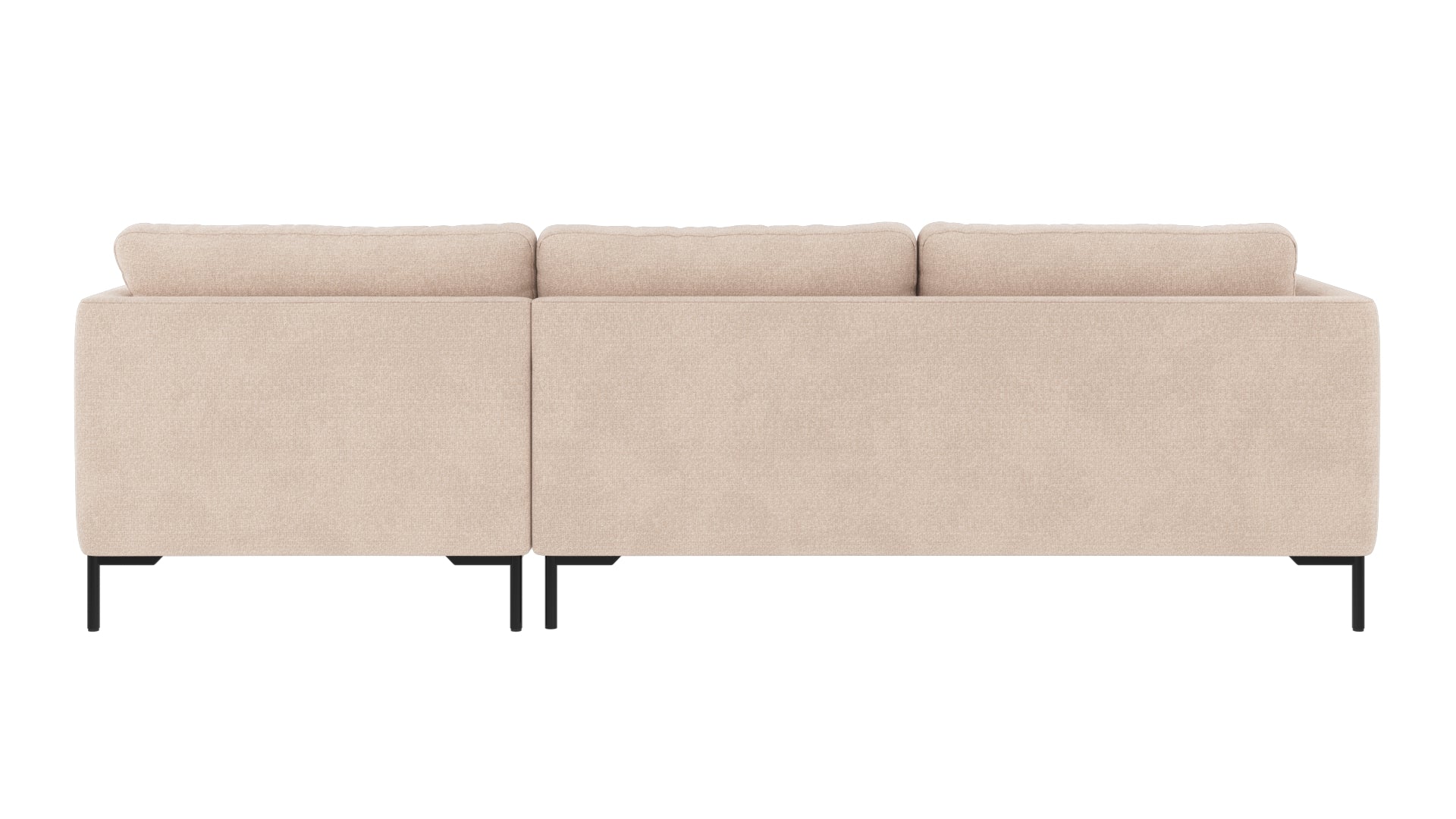 • Beige soffa med schäslong och svarta metallben, vy bakifrån