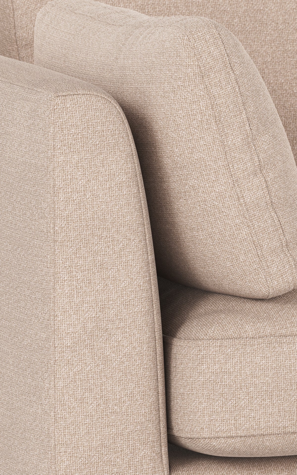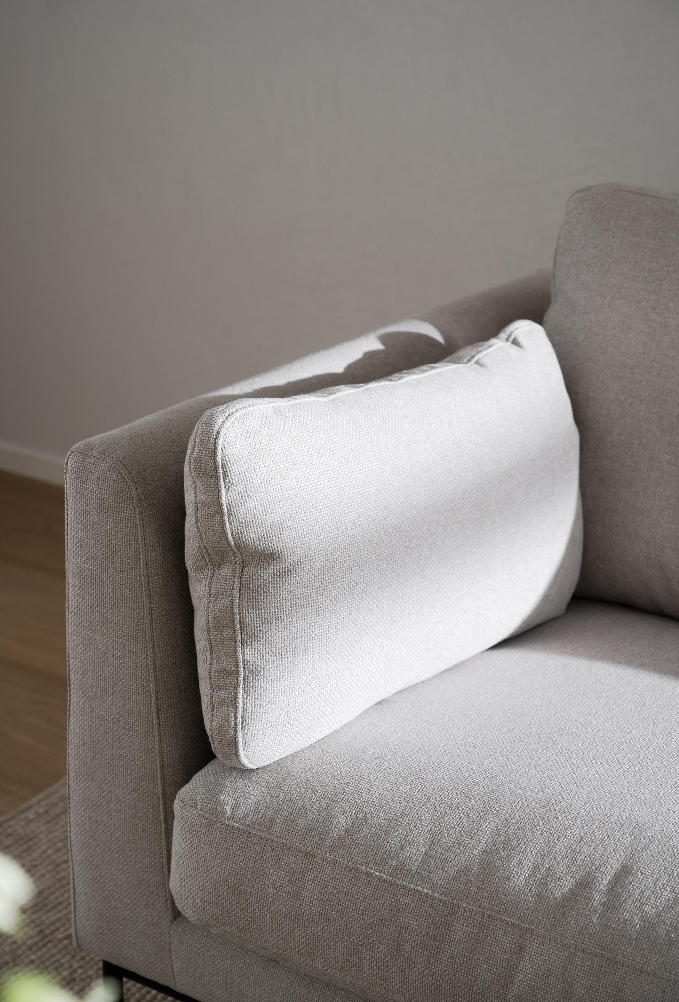 • Grå soffa med vit kudde i linnetyg, närbild på sittdel och armstöd