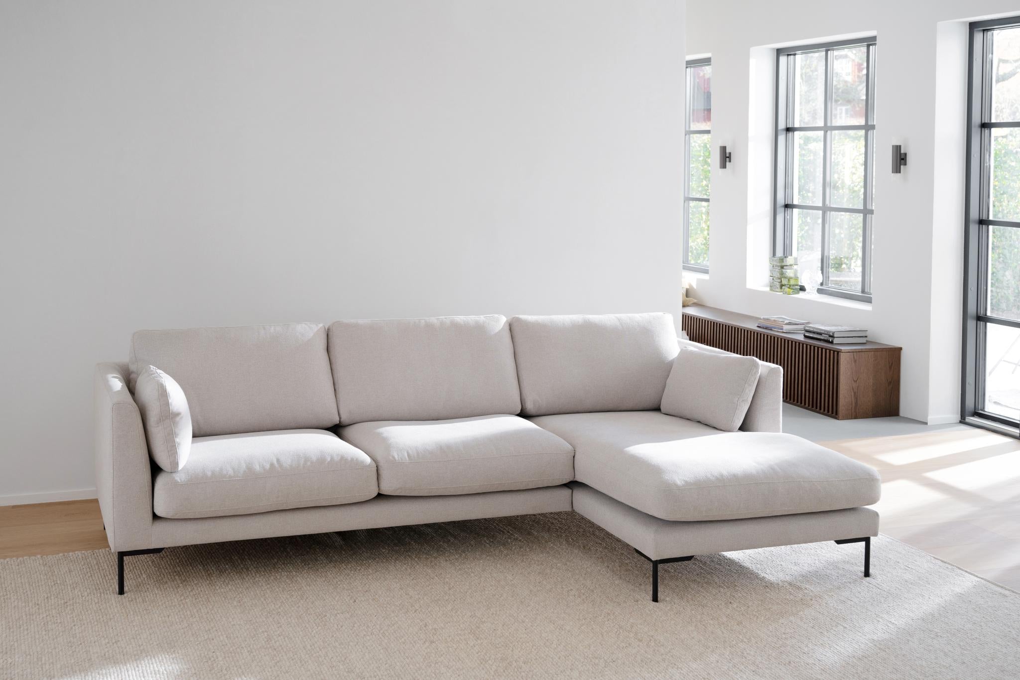 • Ljusgrå soffa med schäslong i modernt vardagsrum med svarta ben och ljusinsläpp från fönster