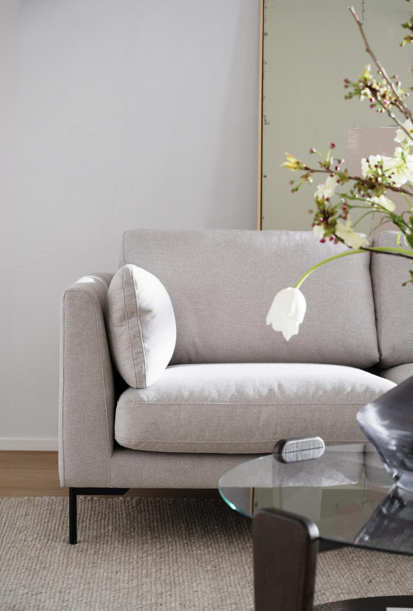 • Beige soffa med svarta metallben på beige matta, närbild av hörn med dyna