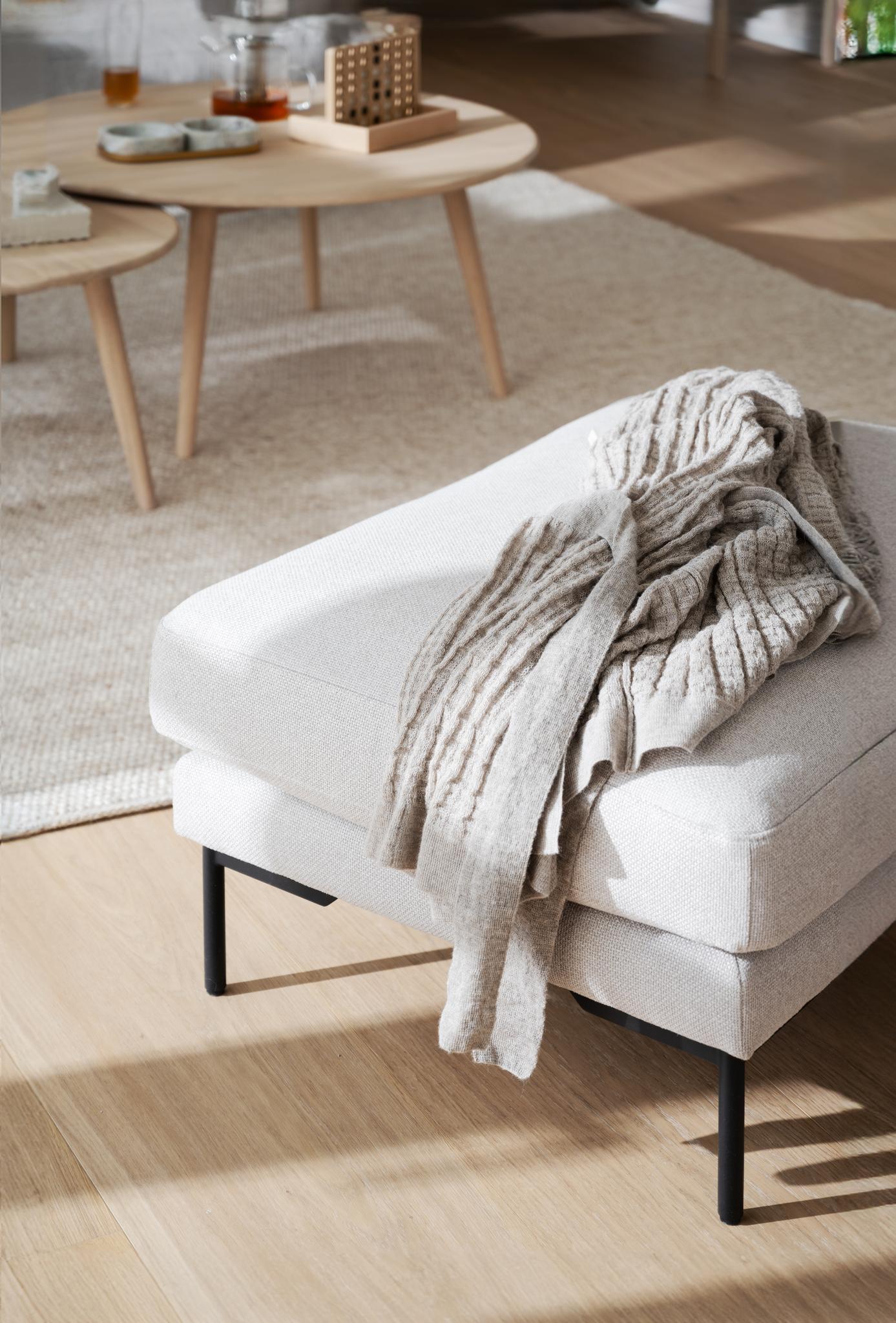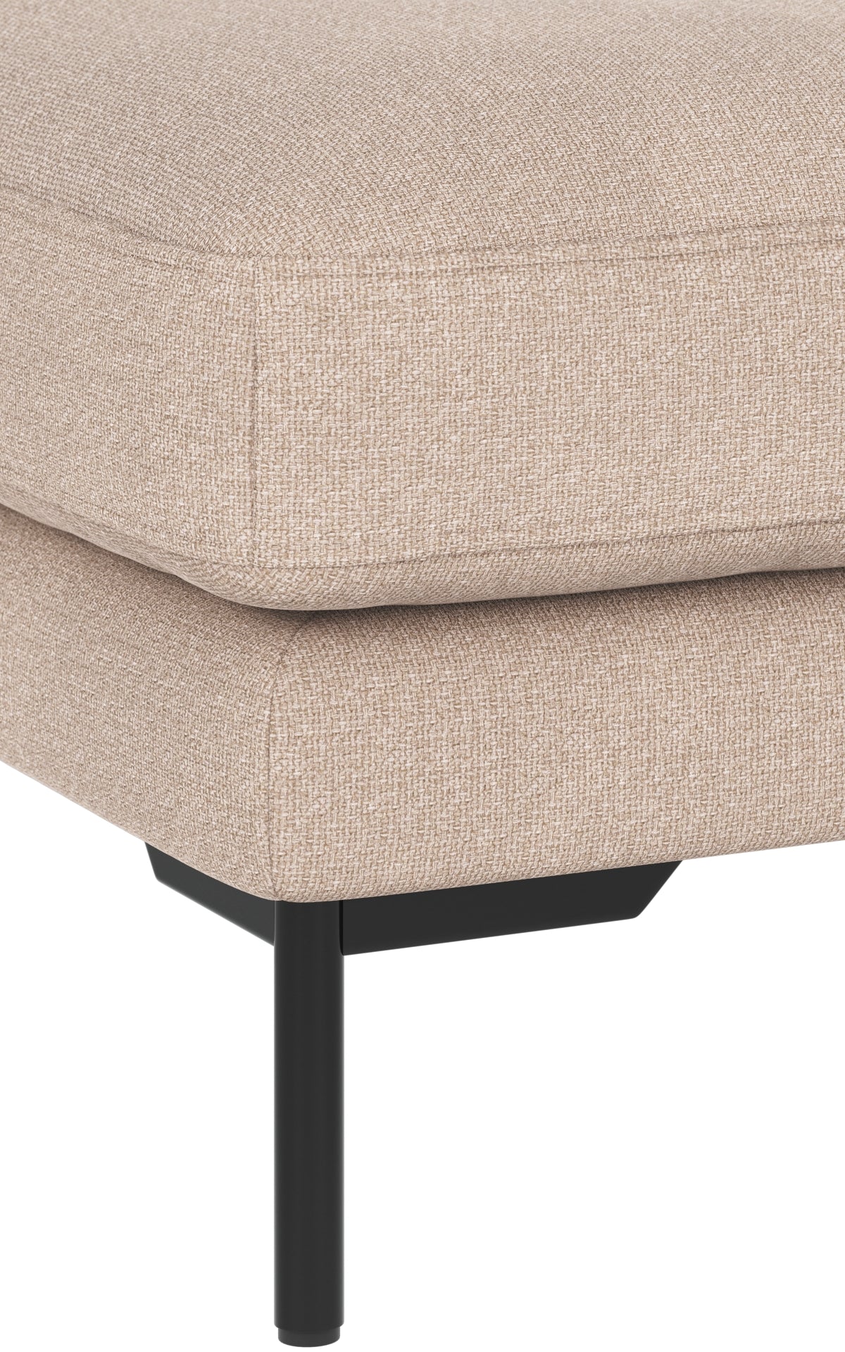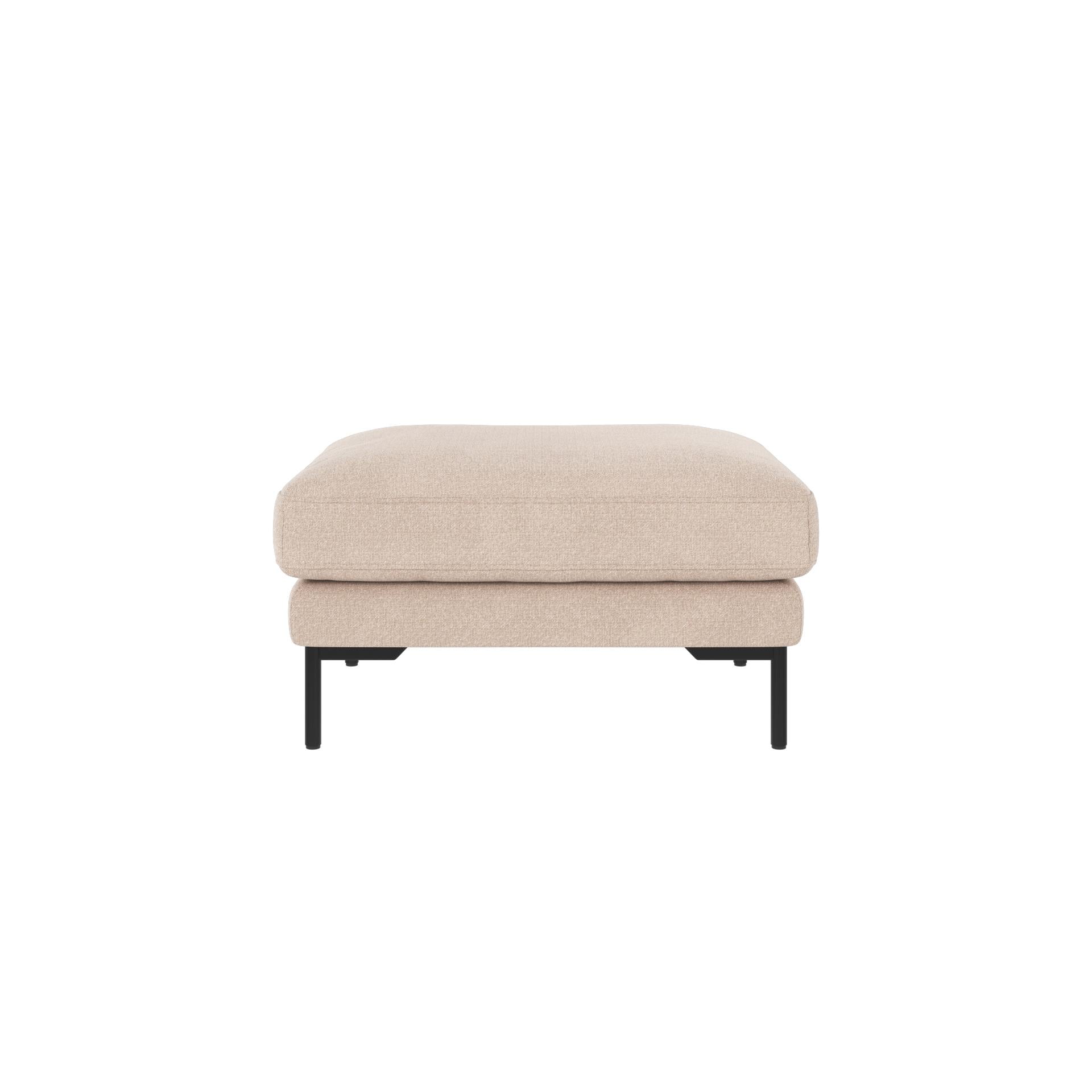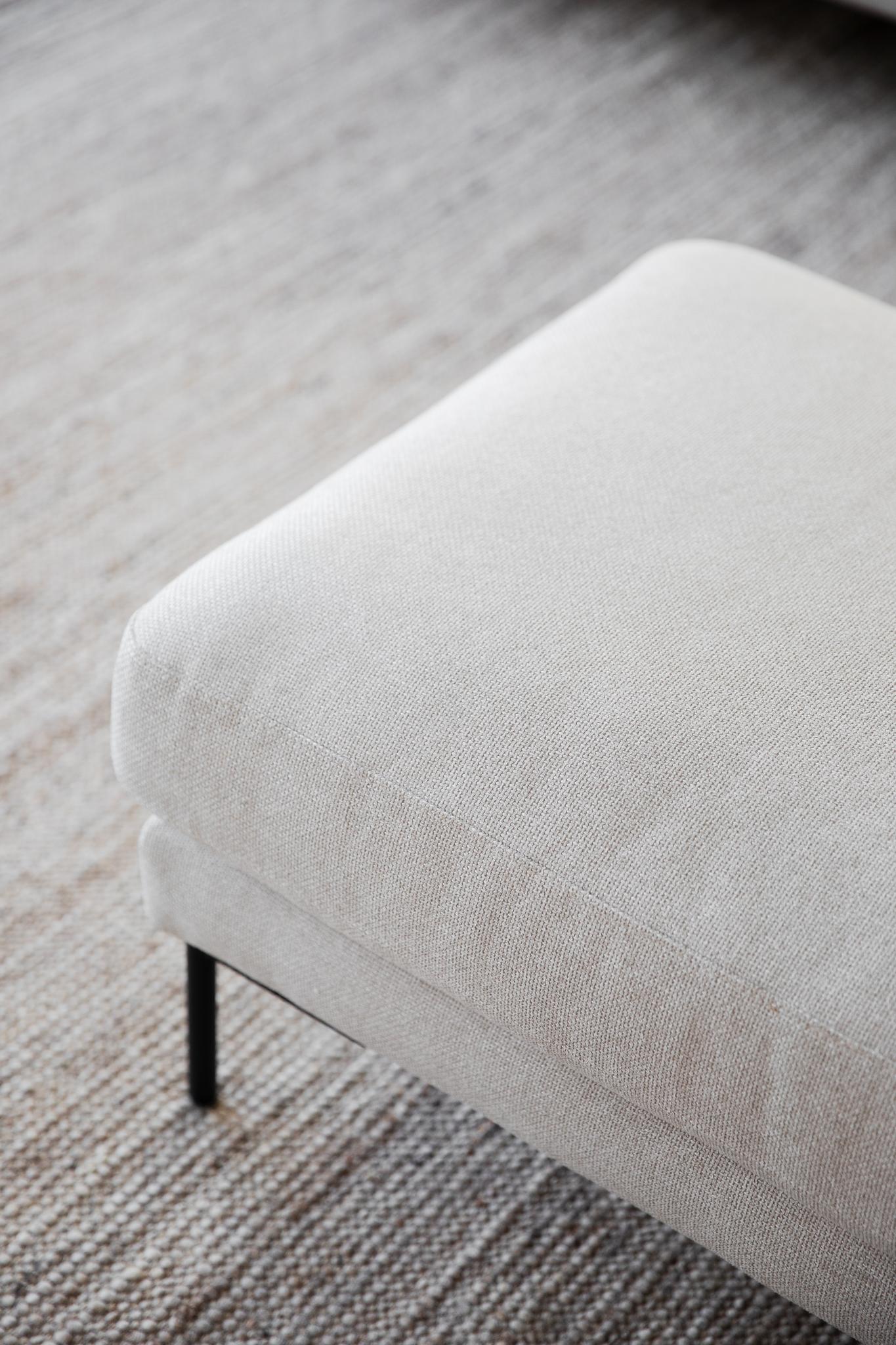 • Beige ottoman med mjuk klädsel och svarta metallben framför matchande soffa i ljust vardagsrum