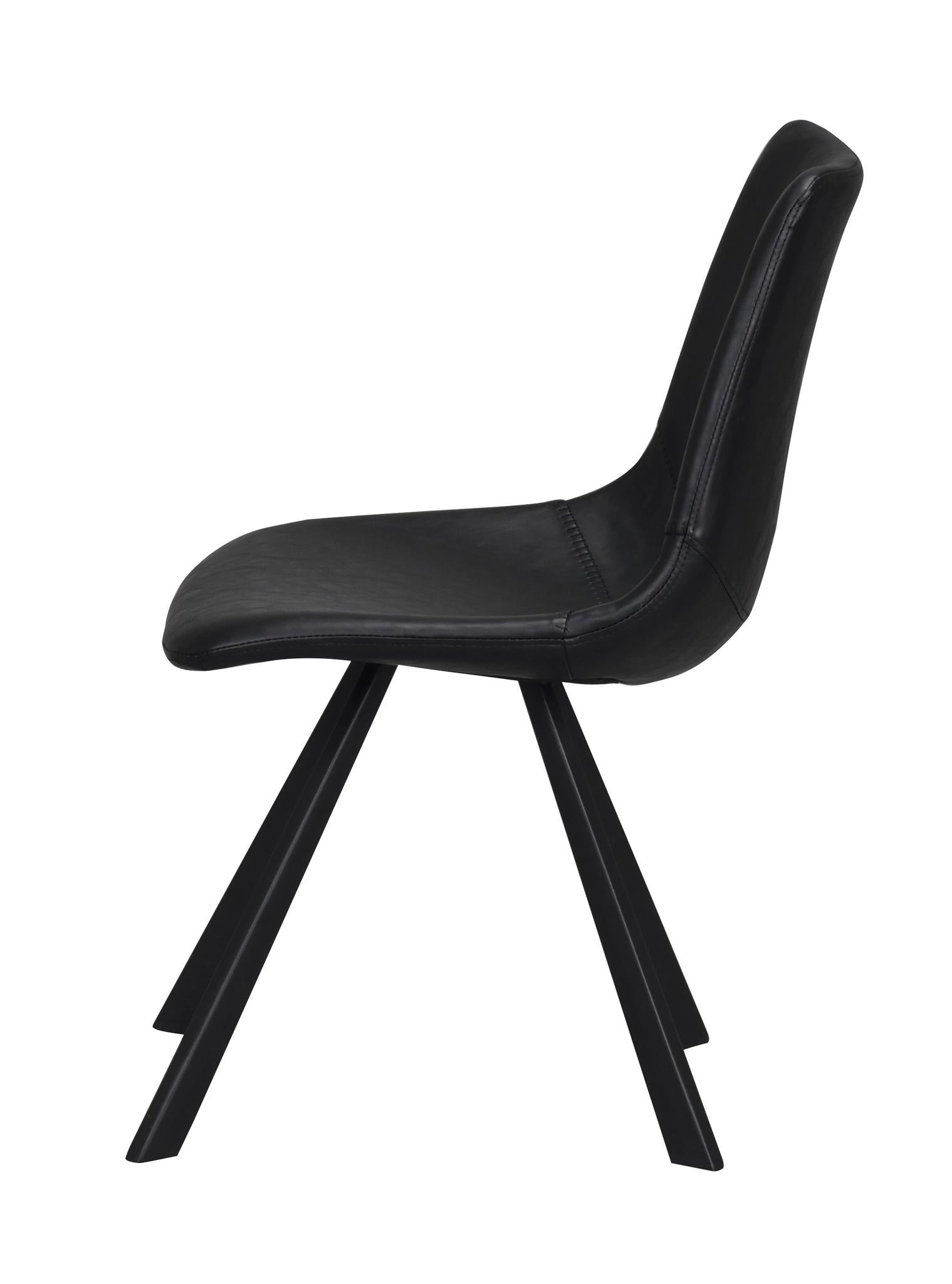 • Svart matstol i konstläder med svarta träben, sidovy som visar stolens eleganta design och komfort