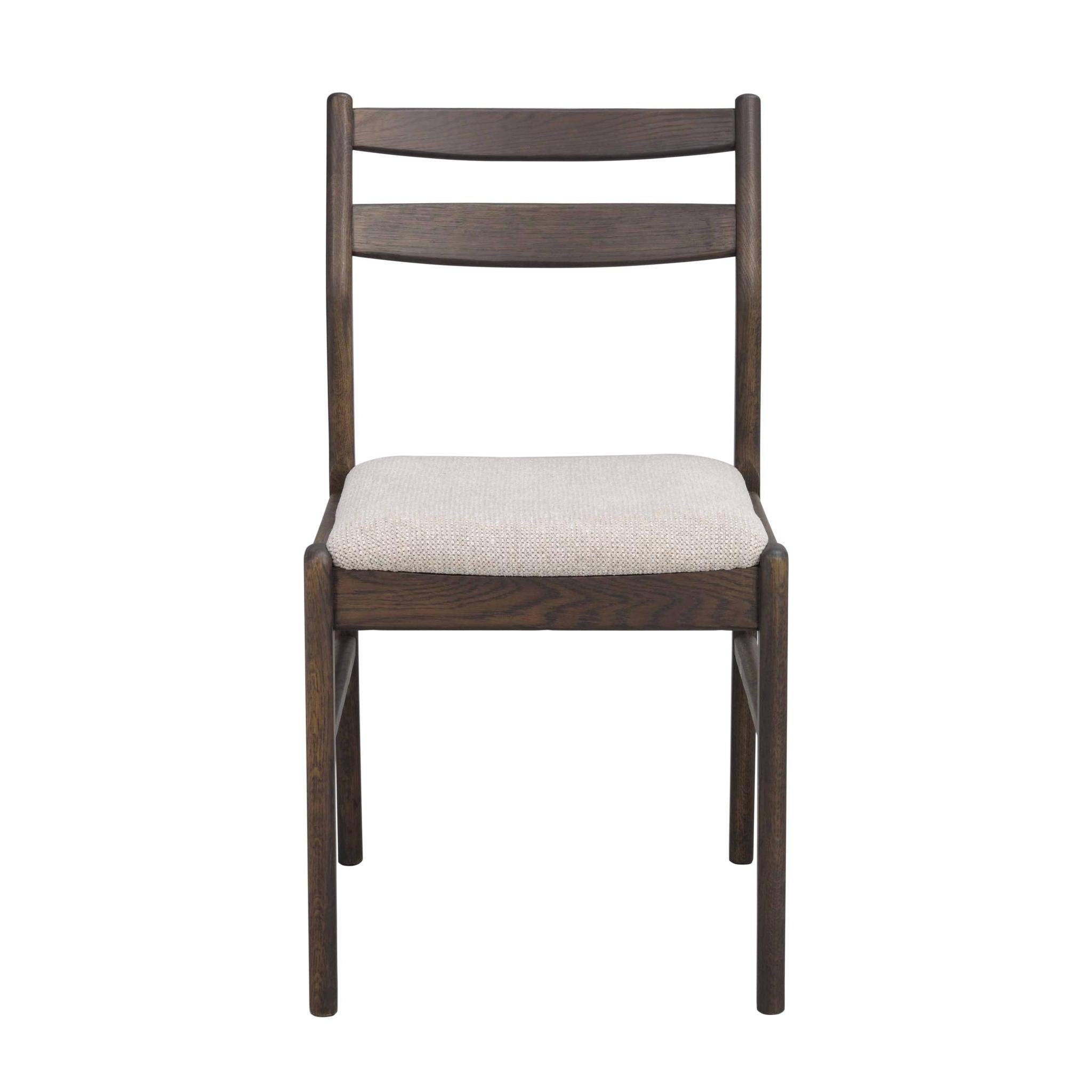 • Mörkbrun dining chair i trä med beige stoppat sits, skandinavisk design mot ljus bakgrund
