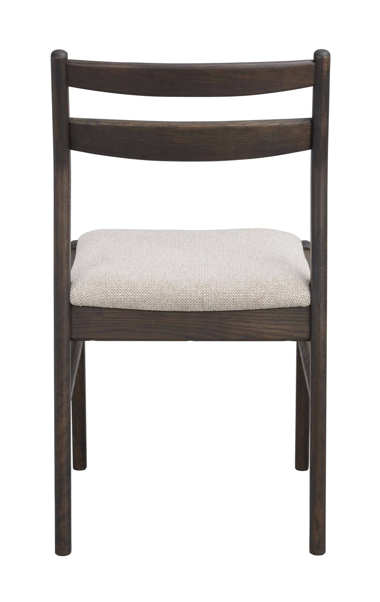 • Matstol i mörkt trä med ljust stoppad sits och två ryggslåar, skandinavisk design