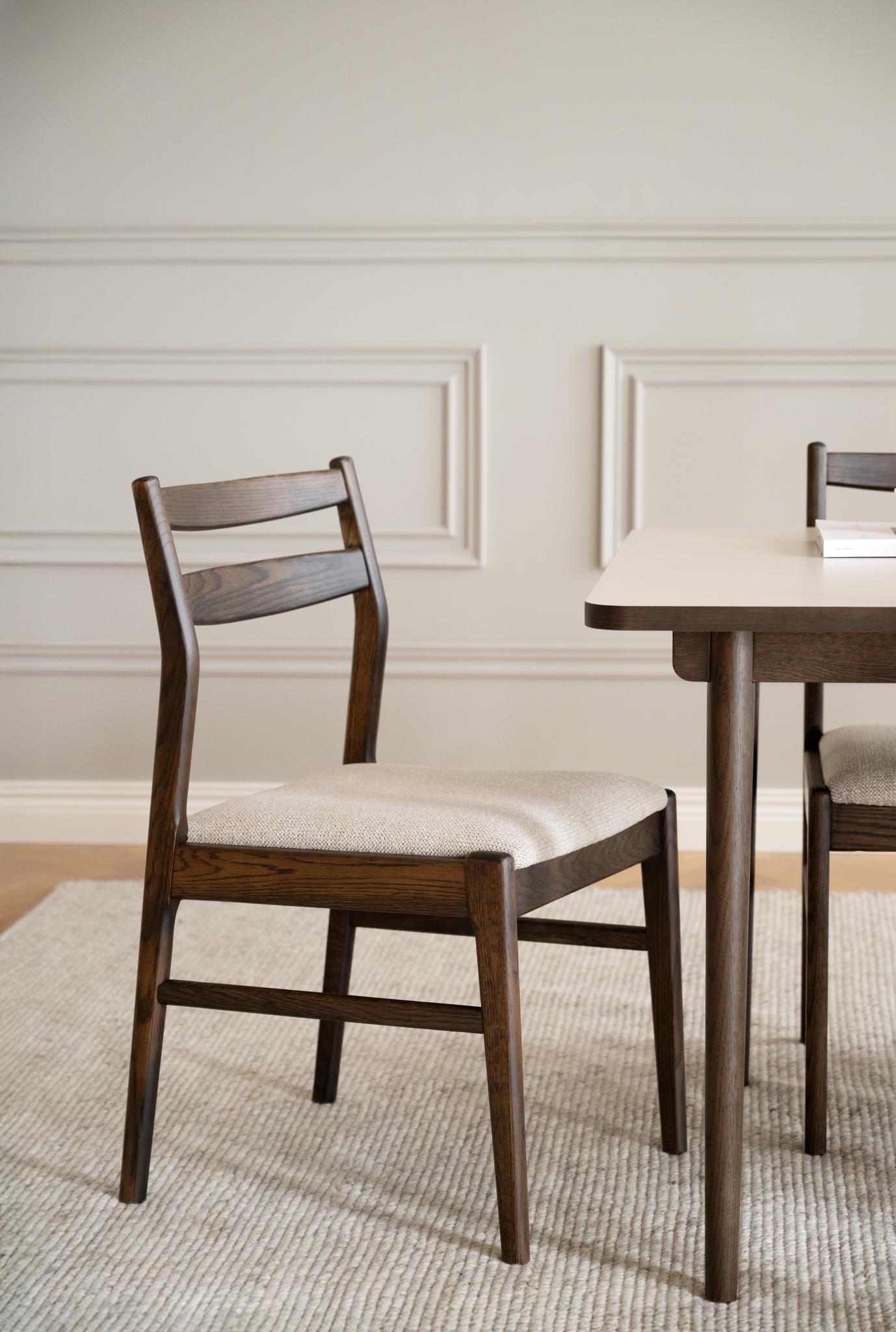 • Matstol i mörkbejsat trä med stoppad sits i ljust tyg, vid matbord mot vit panel
