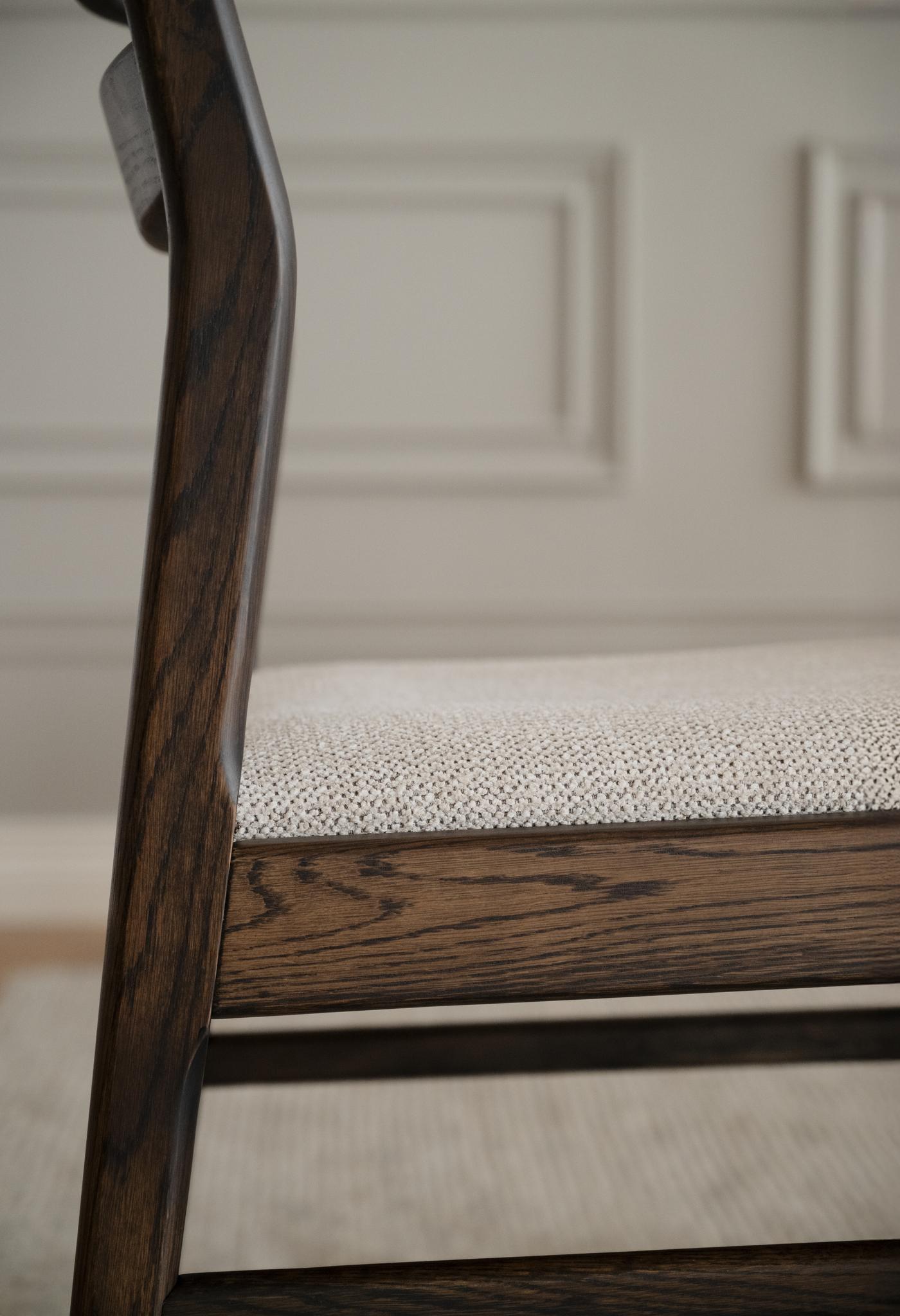 Kerwin-stolen i brun ek har en design inspirerad av dansk formgivning från 50- och 60-talet. Det är en stilren och mångsidig möbel med vackra hantverksdetaljer. Stolen är tillverkad i massiv ek med både rundade och raka former, en design som harmoniserar lika fint med runda som rektangulära matbord.