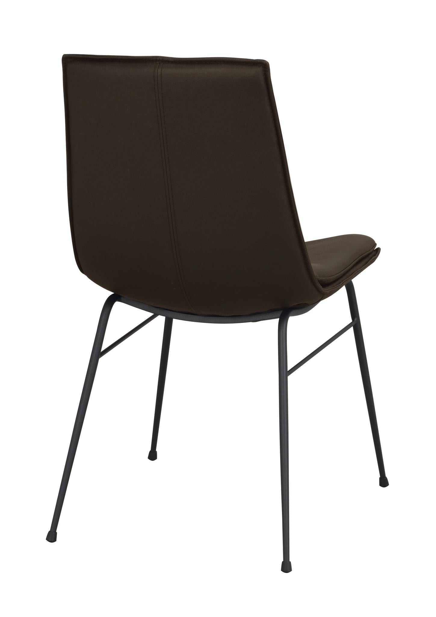 • Brun matstol med metallben, sedd bakifrån, modern design med konstläder