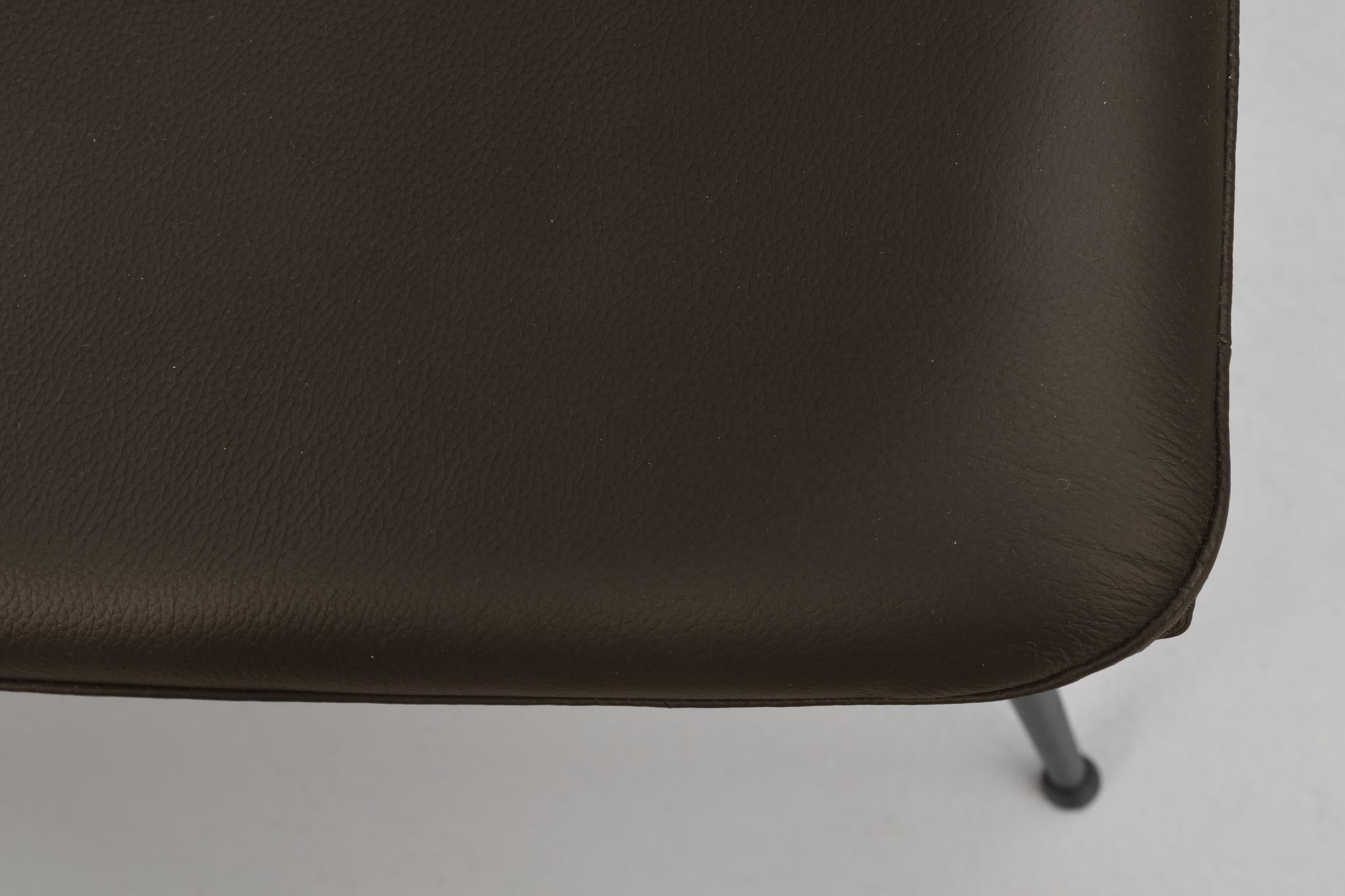 Stoppad stol med äkta läder på plywoodstomme, ben i pulverlackad metall i sandstruktur. Fot i gummi.
