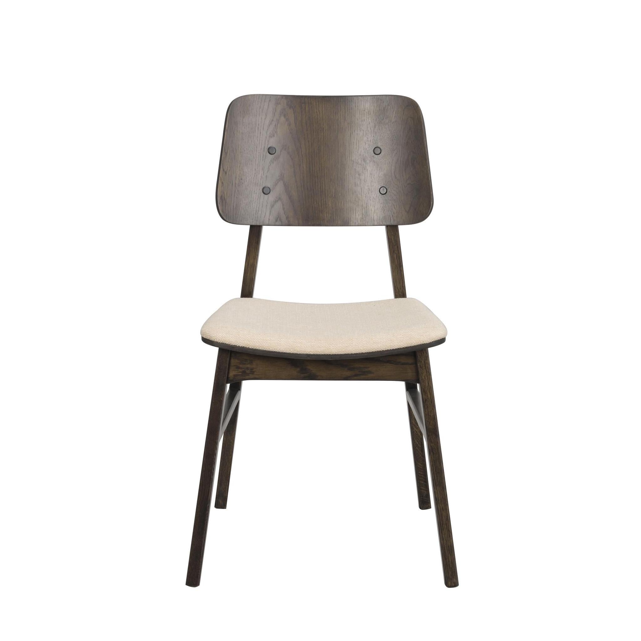 • Matstol i mörkbetsad ek med beige stoppad sits och träryggstöd med dekorativa nitar