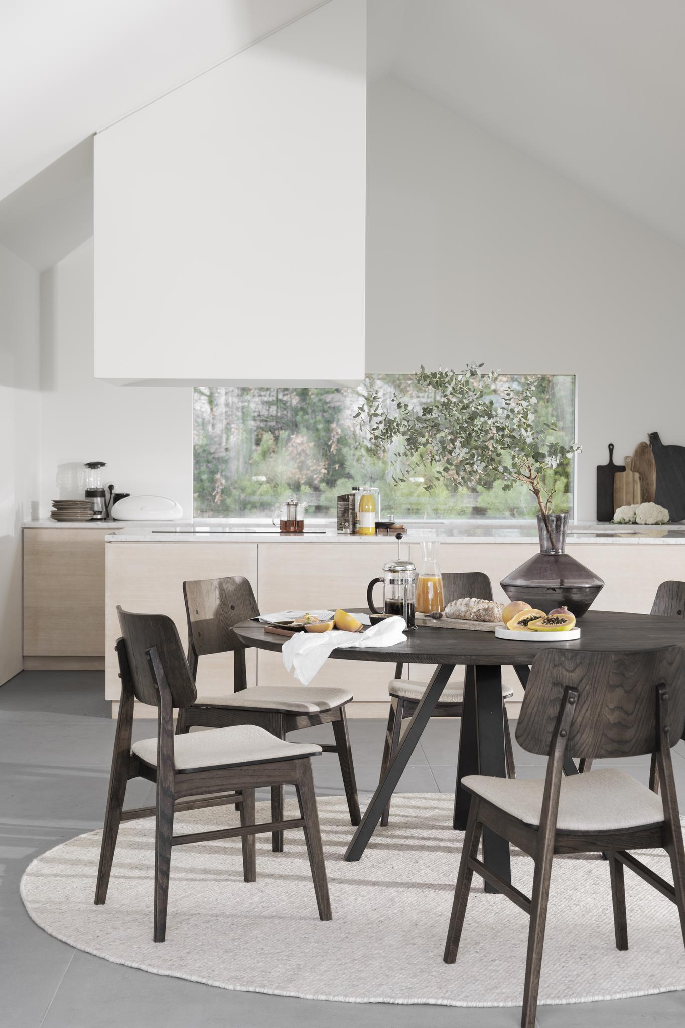 • Matgrupp i mörkt trä med runt bord och stolar i modern skandinavisk matsal med öppet kök