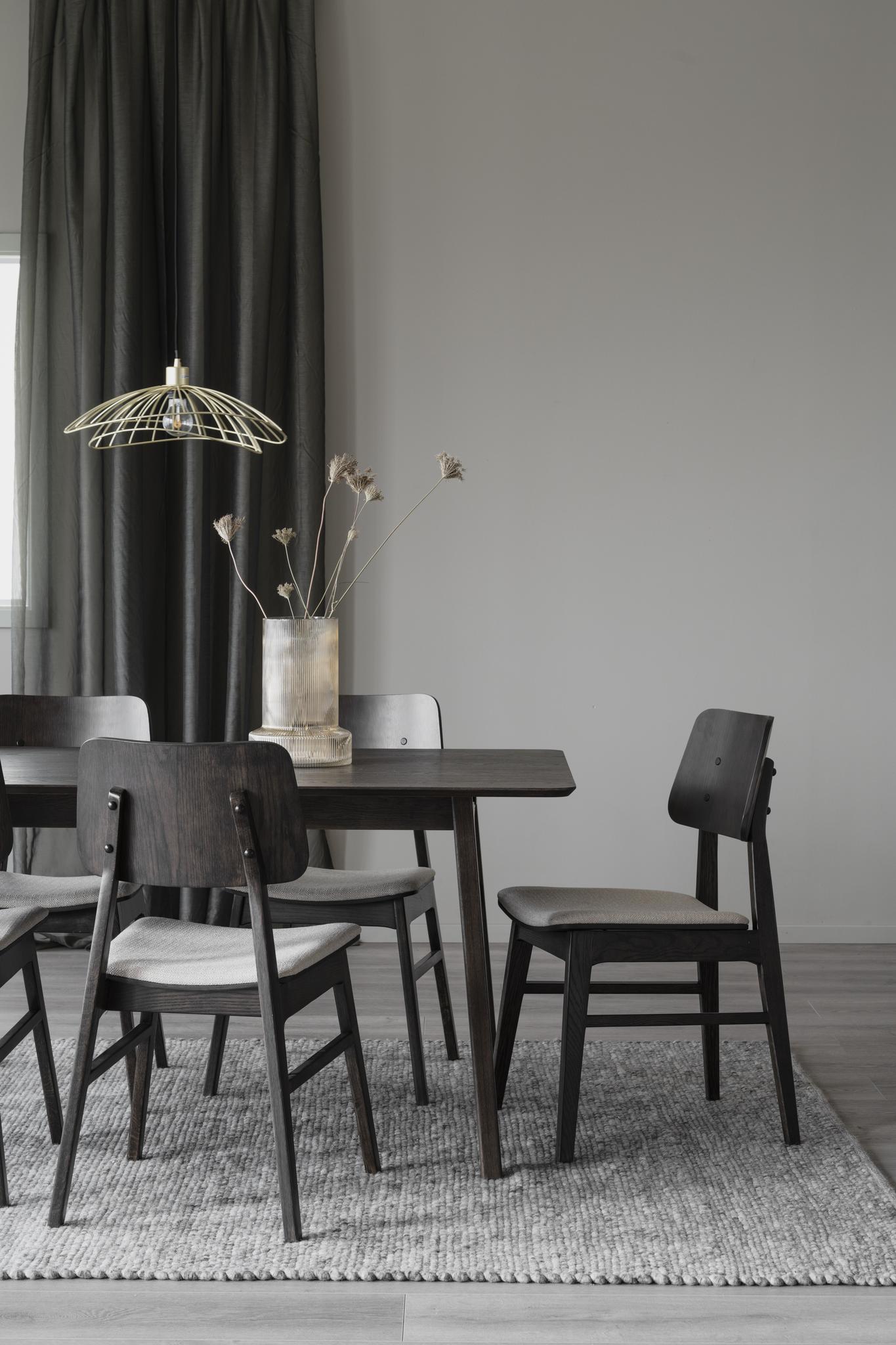 • Matgrupp i svartbetsad ek med fyra stolar och rund pendant-lampa i skandinavisk stil