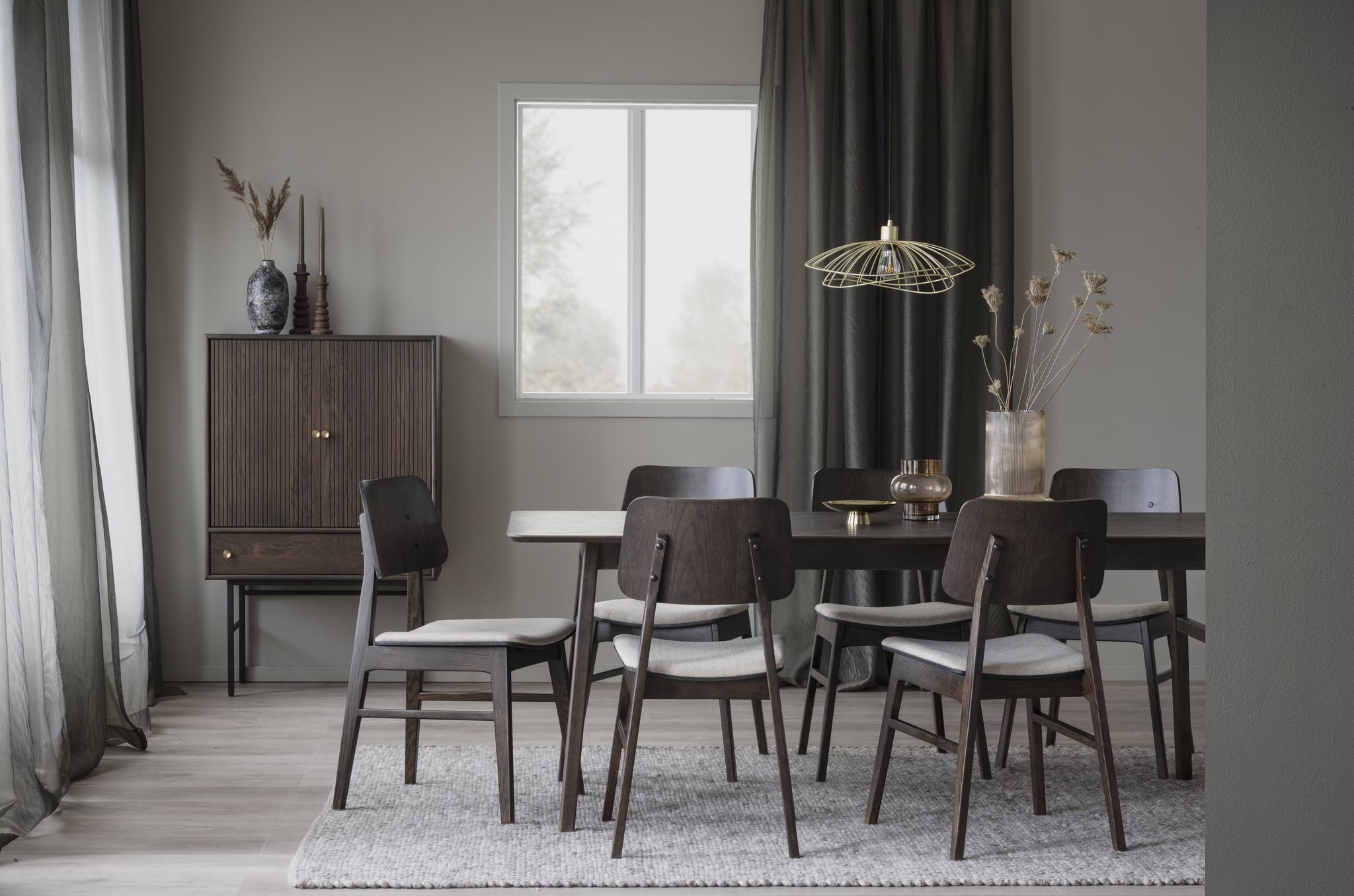• Matgrupp i mörkt trä med sex stolar i modern matsal med grå toner och stilren inredning