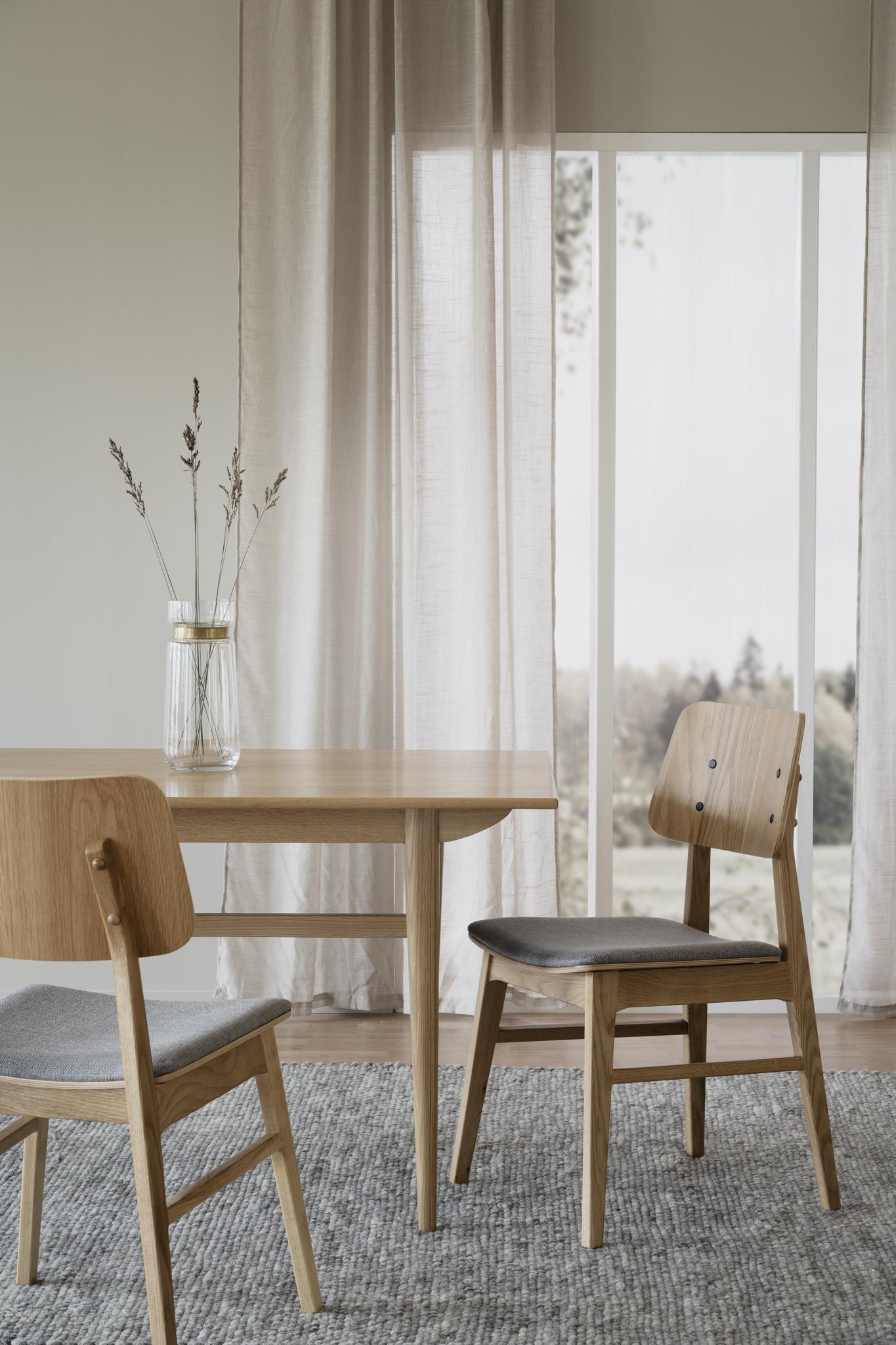Massiv ek i ben och stomme. Plywood i sits och ryggbricka. Ekfanér på ryggbrickans fram och baksida.