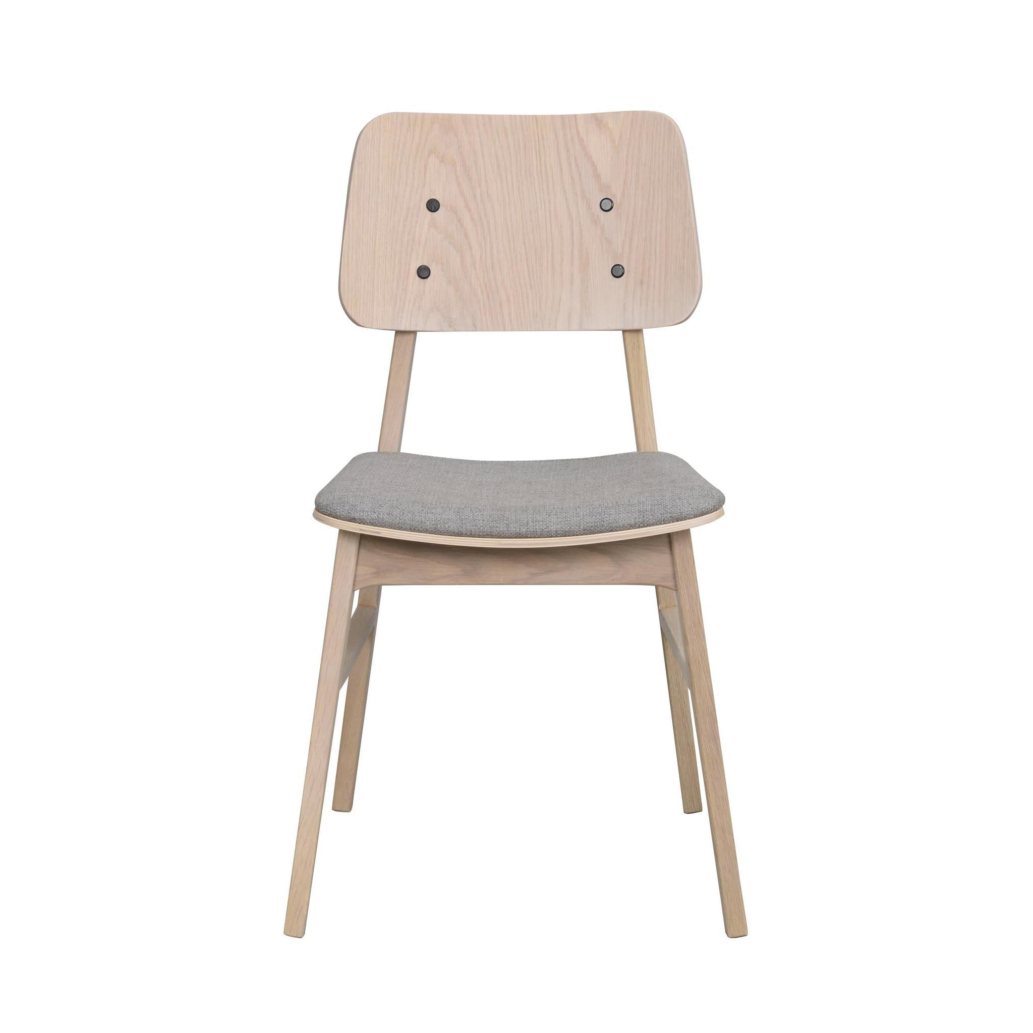 • Matstol i ljust trä med grå stoppad sits och ryggstöd med fyra synliga skruvar