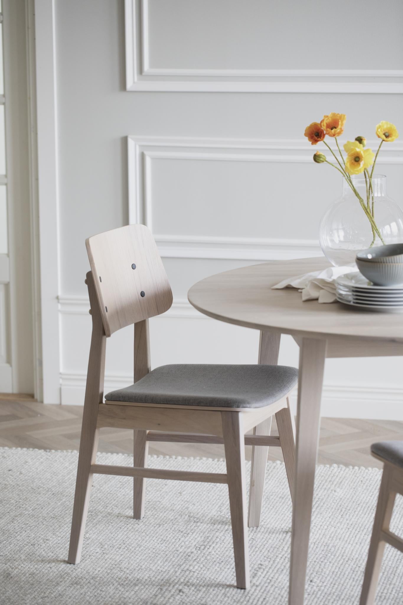 • Ljus trämatstol med grå sits bredvid runt matbord i skandinavisk stil med vita väggar i bakgrunden
