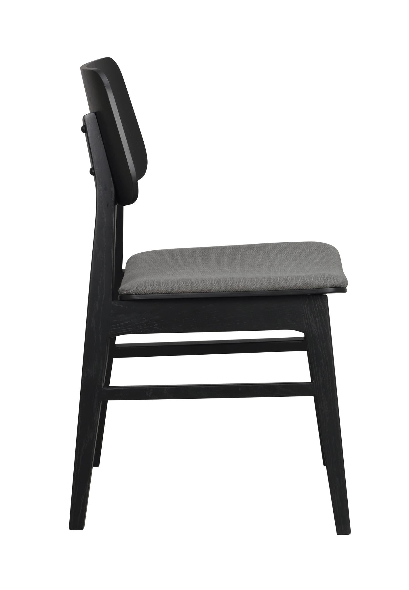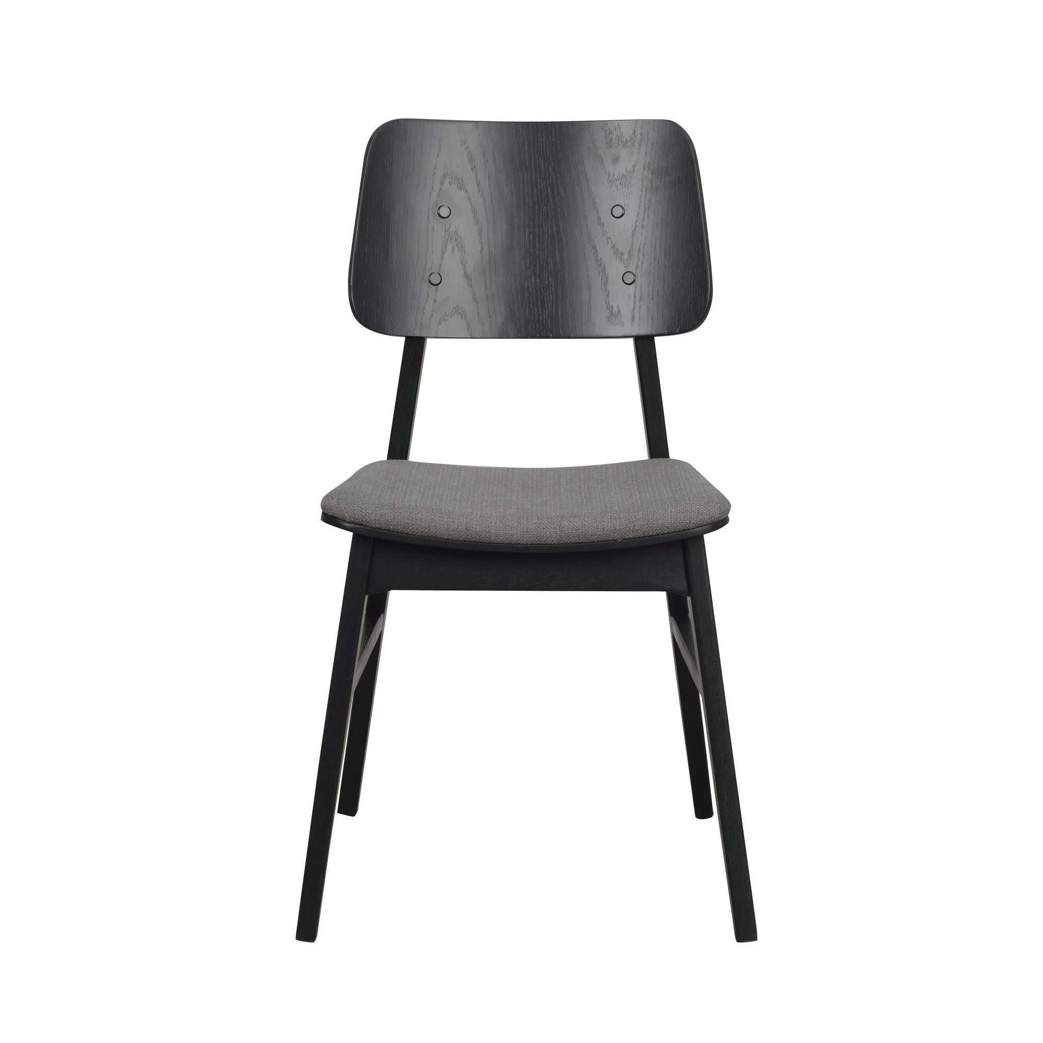 • Svart trästol med grå stoppad sits och ryggstöd i modern skandinavisk design