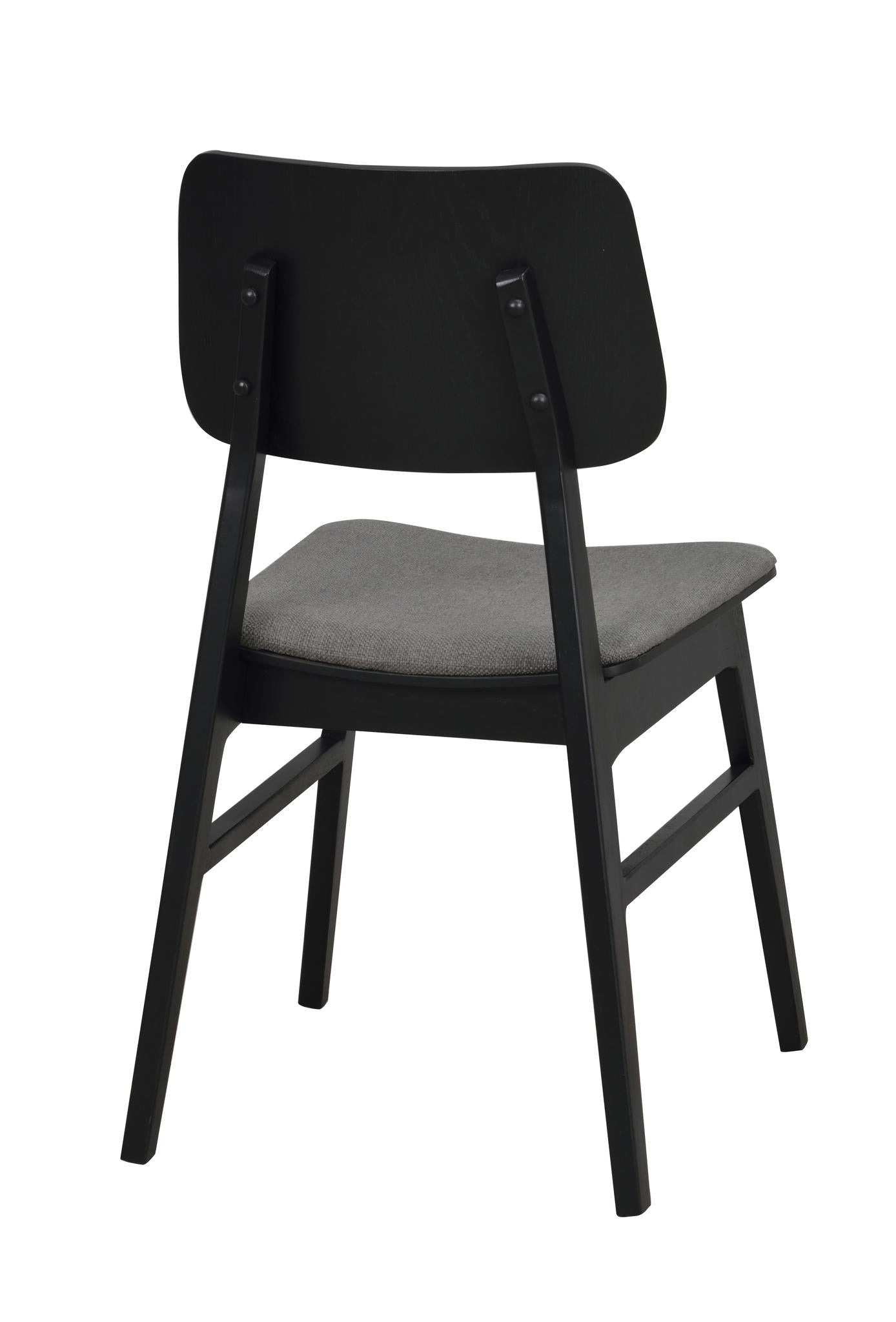 • Svart stol med grå stoppad sits och svarta träben, sedd bakifrån
