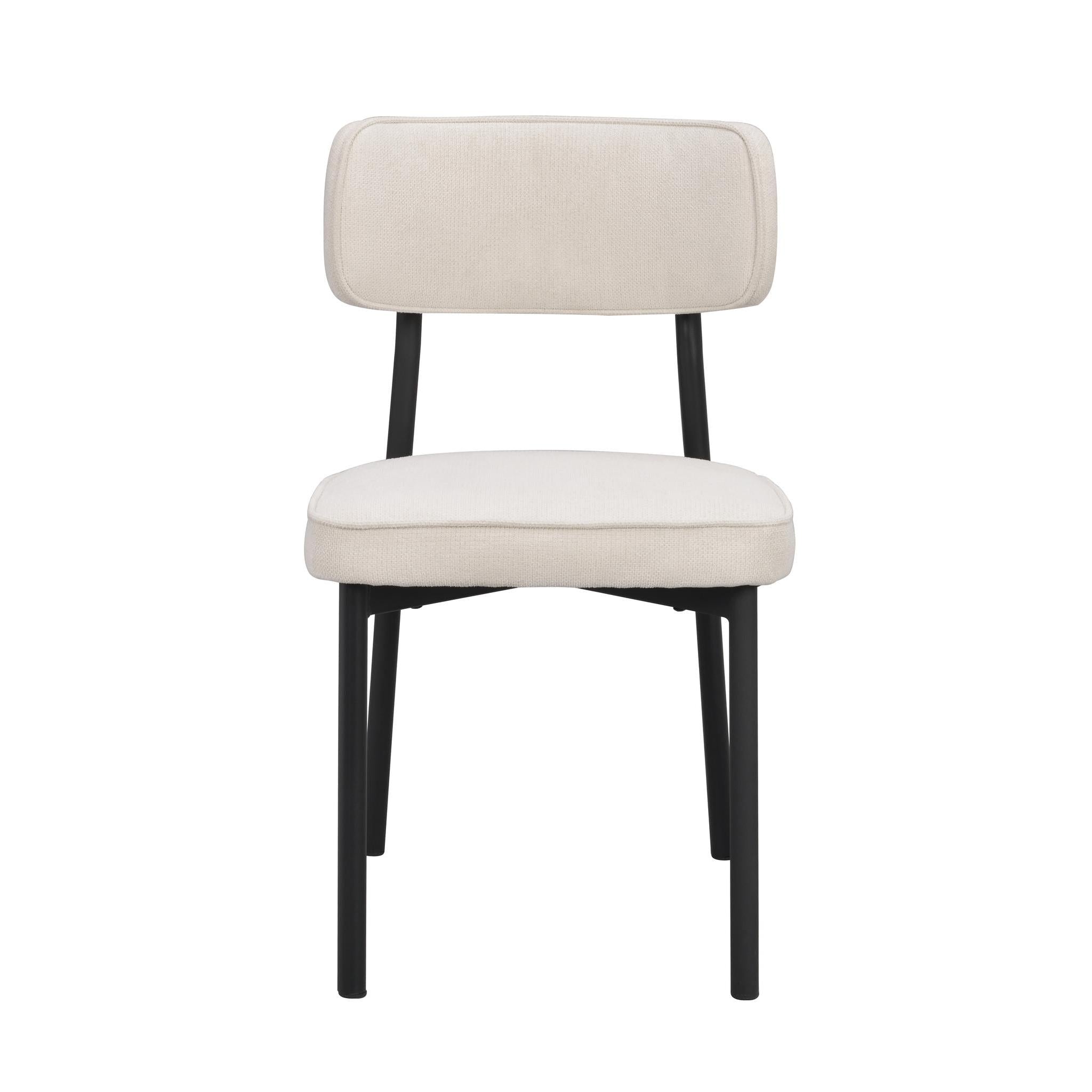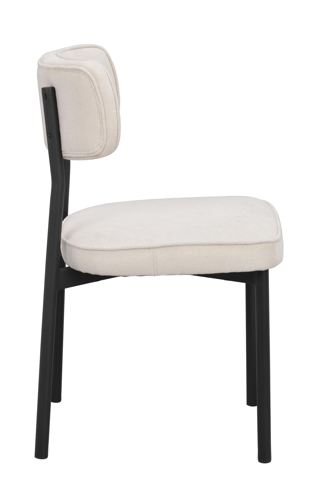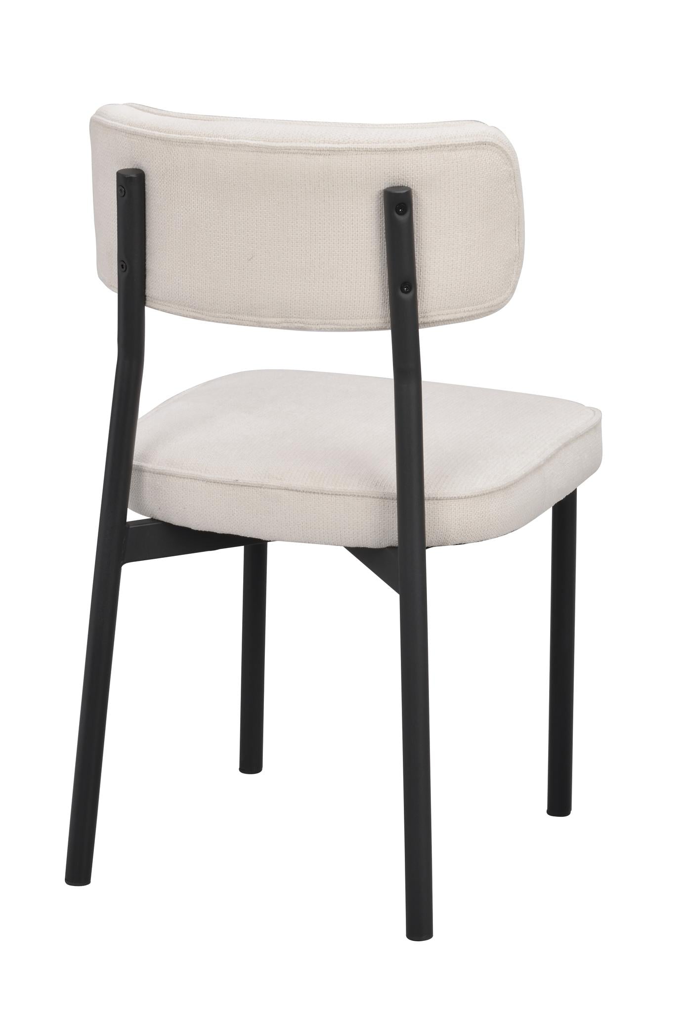• Matstol med cremevit klädsel och svart metallstativ, sedd från baksidan