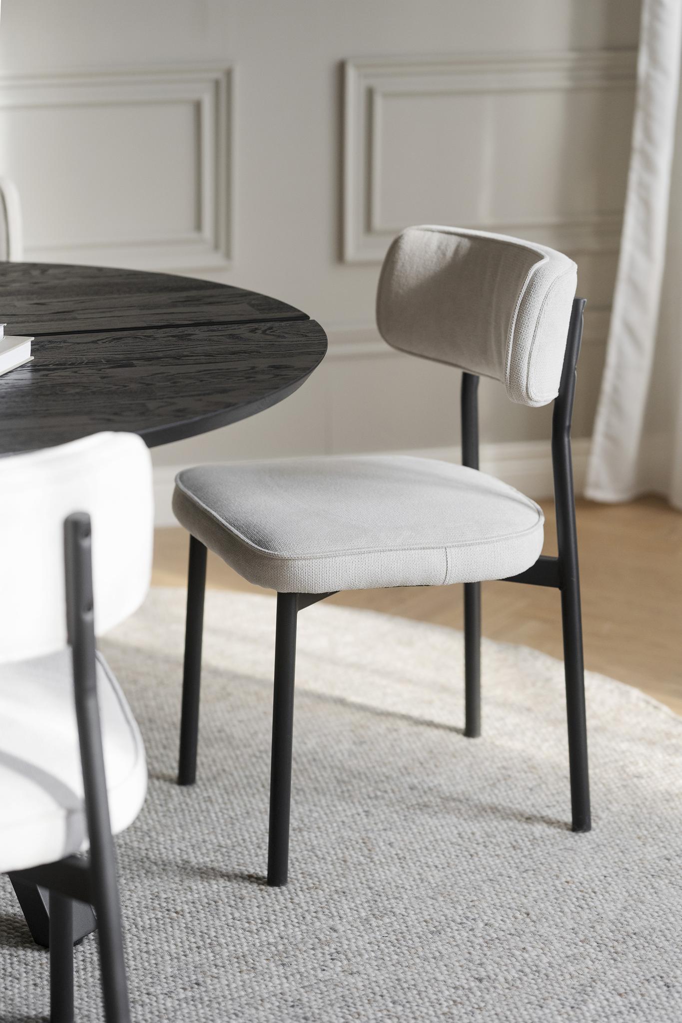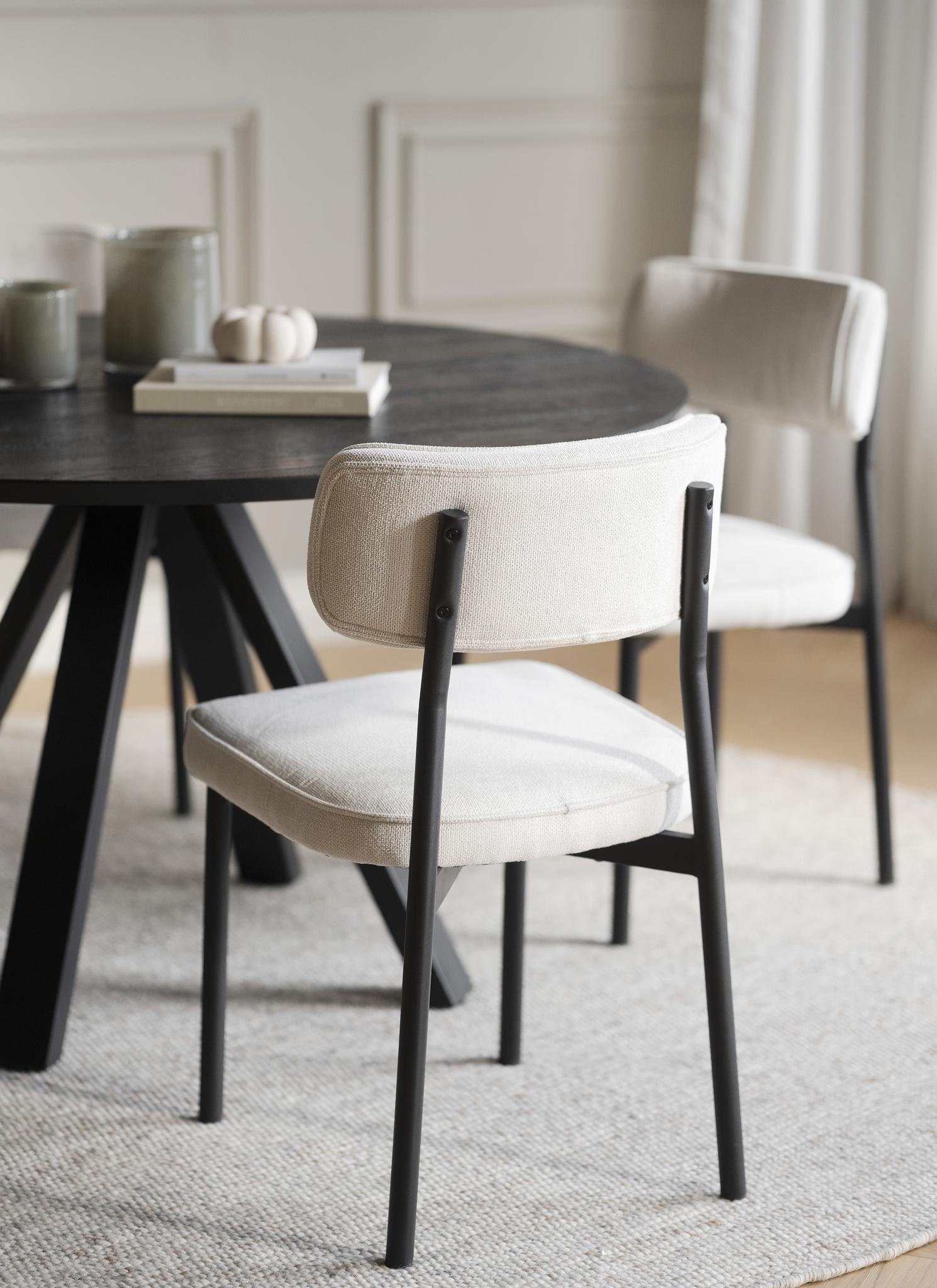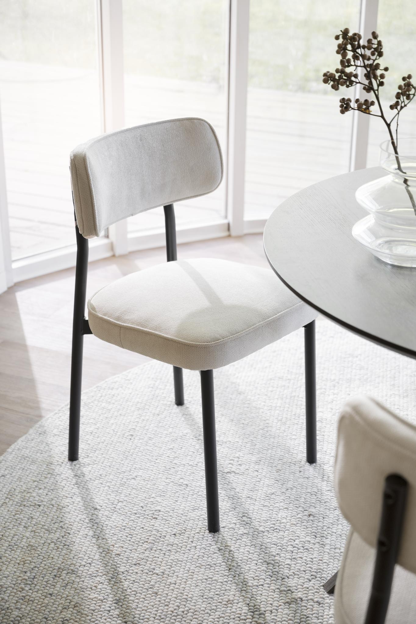 • Beige stol med svarta ben vid runt matbord i ljust rum med fönster