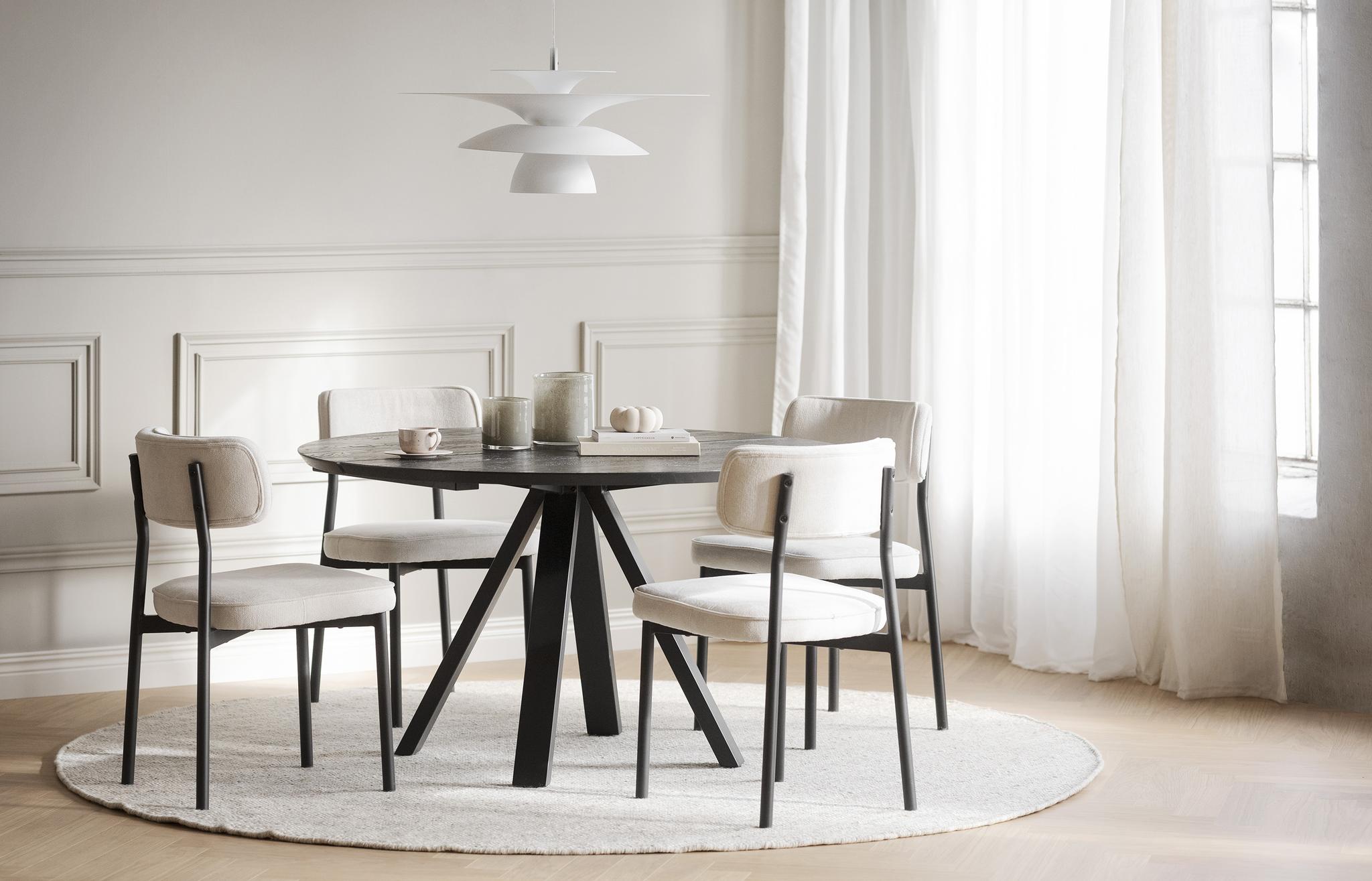 • Rund matgrupp med svart bord och fyra beige stolar i modern matsal med vit inredning