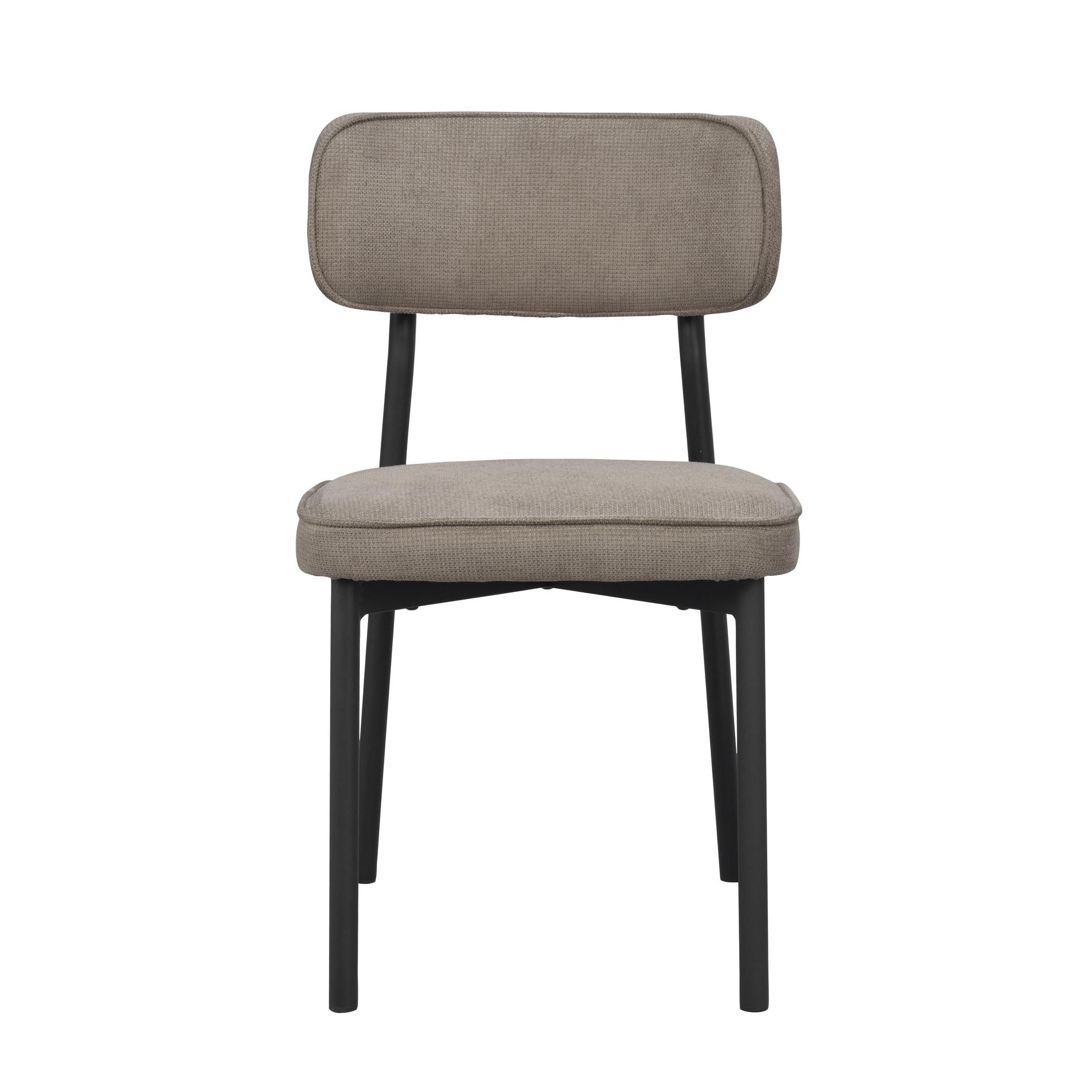 • Matstol med beige tyg och svarta ben, modern design med stoppad sits och ryggstöd
