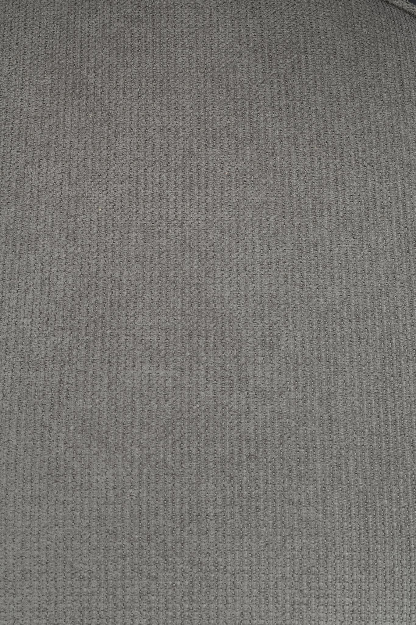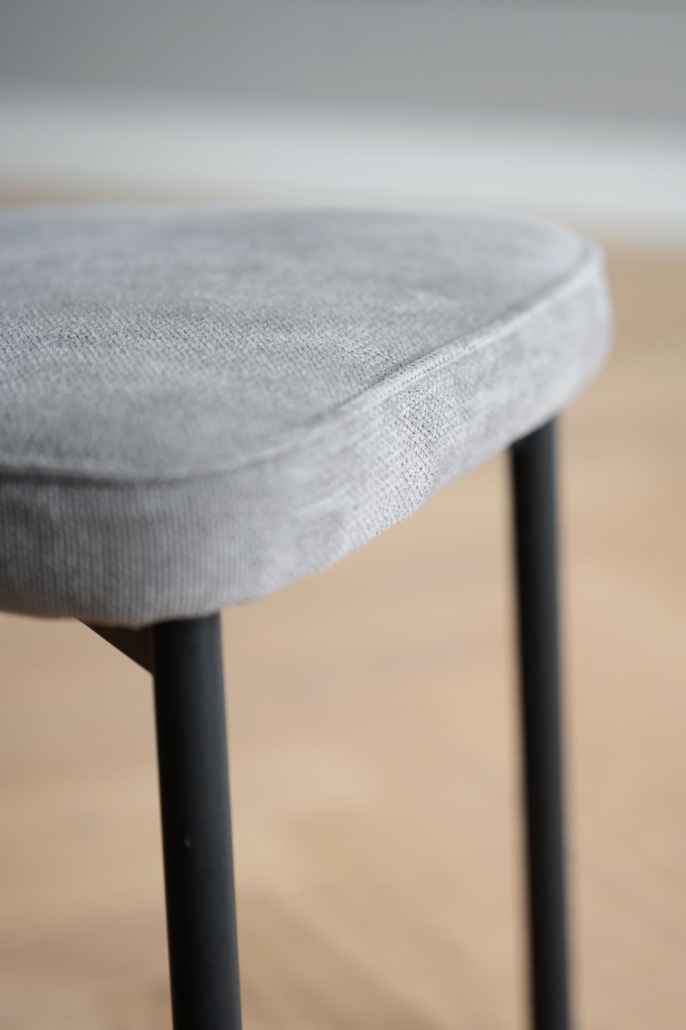 • Grå stoppad pall med tyg och svarta ben i närbild