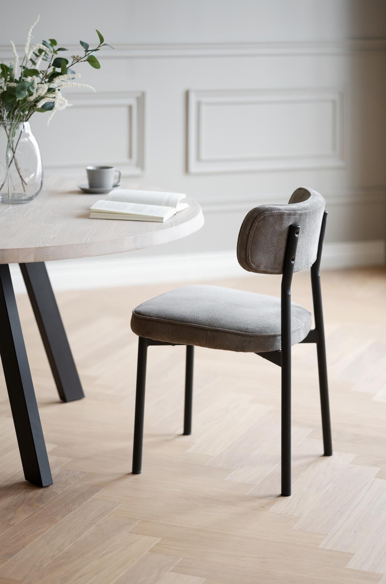 • Grå stoppad stol med svarta ben vid matbord i minimalistisk skandinavisk stil