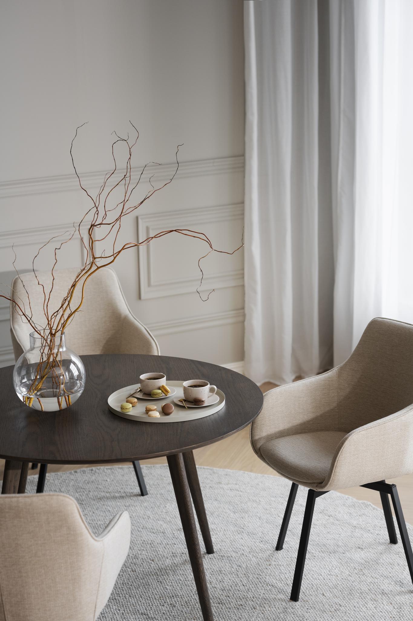 • Rund matbord i mörkt trä med beige stolar i modern skandinavisk stil, dekorerat med vas och kaffe