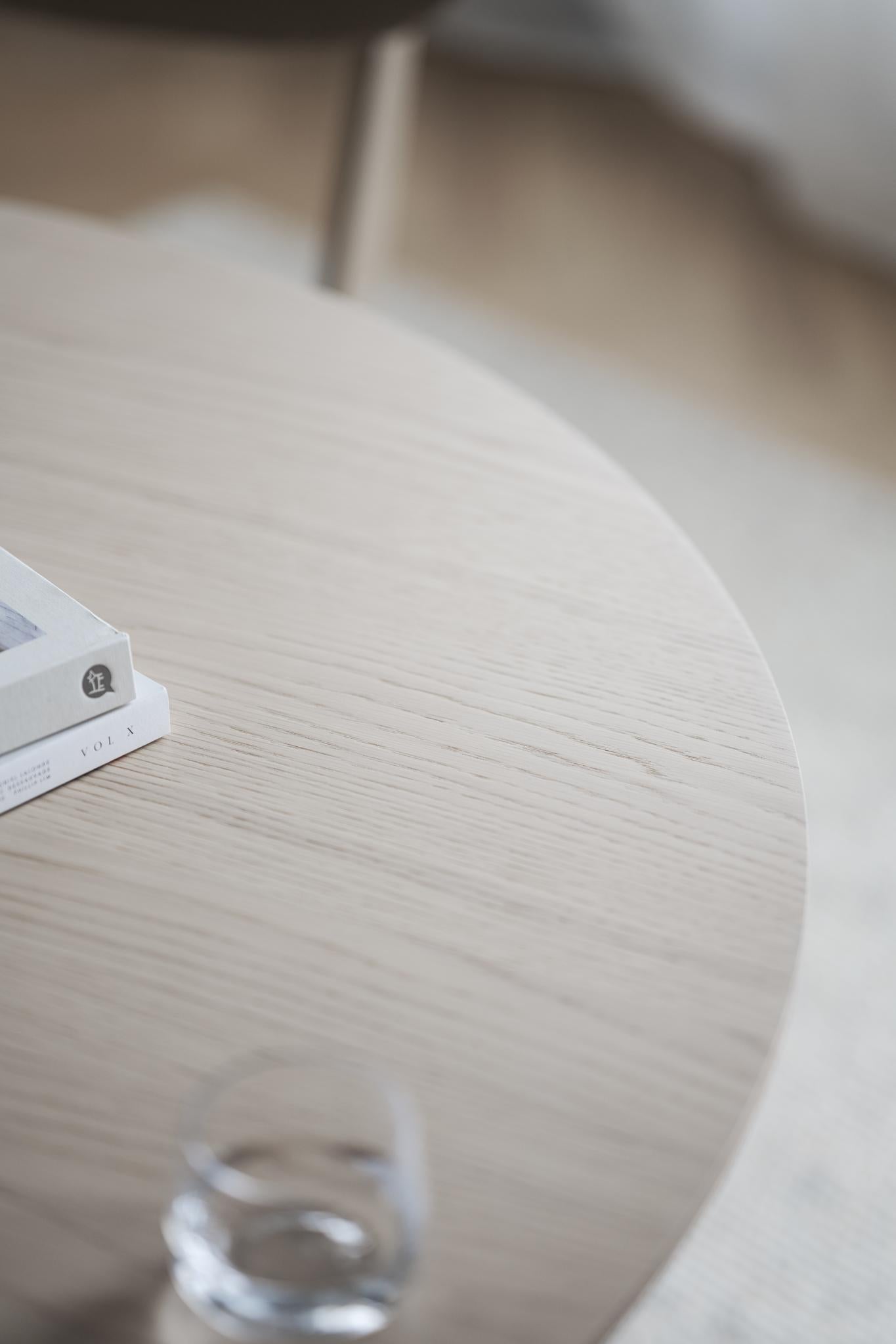 • Runt matbord i ljust trä med tre ben och minimalistisk skandinavisk design