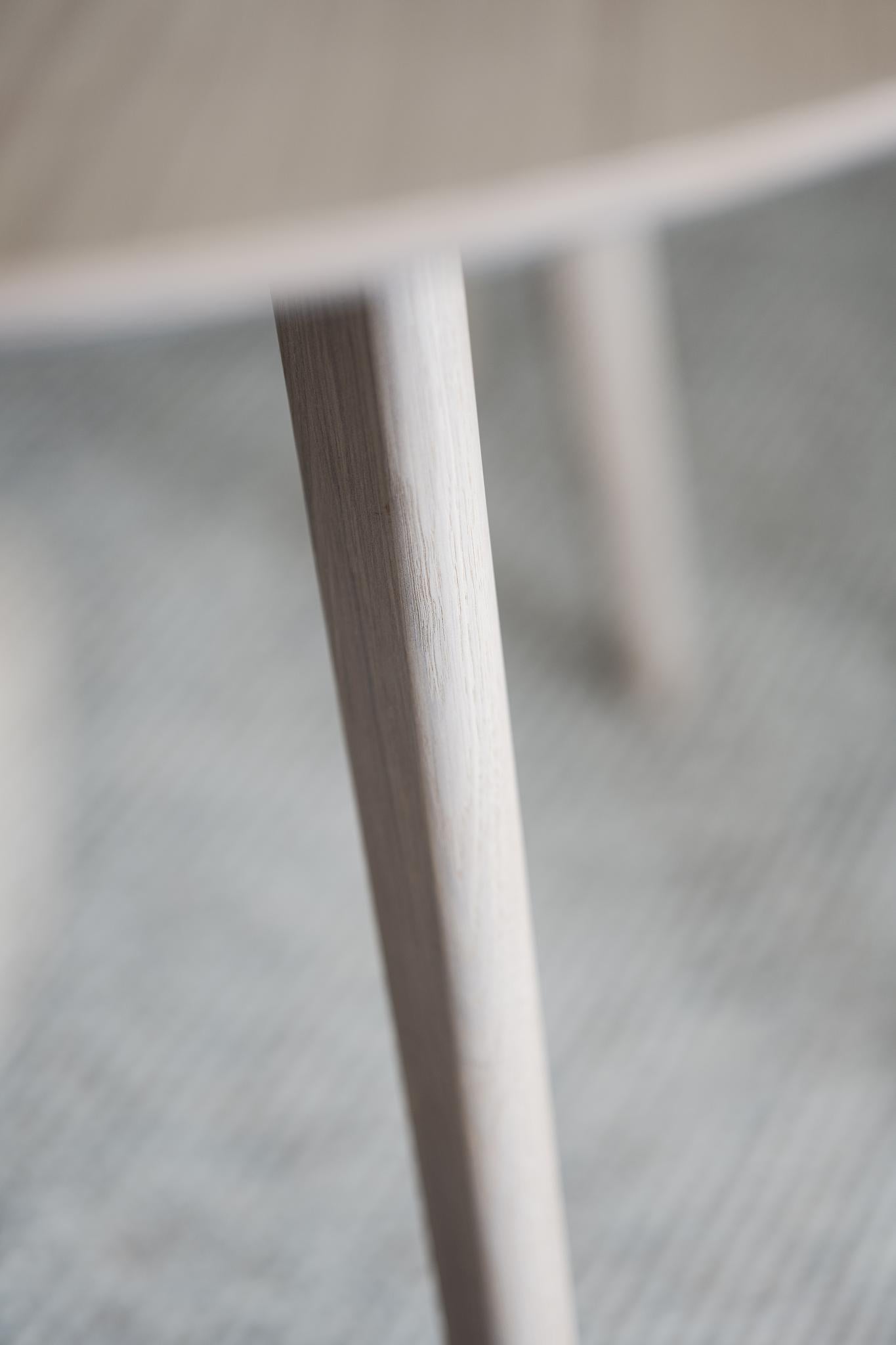 • Närbild på ljust träben i ek med synlig ådring på modern skandinavisk möbel