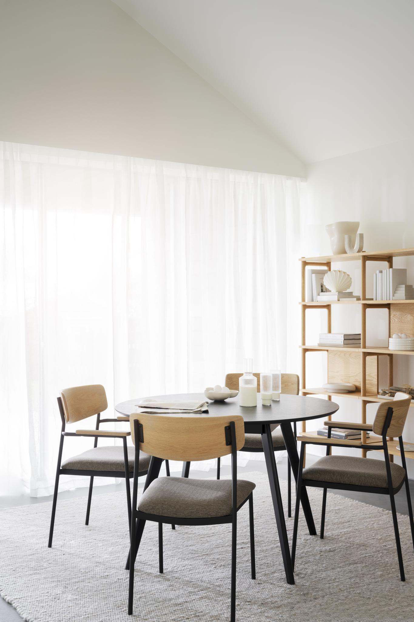 • Matgrupp med svart runt bord och fyra stolar i ek och grå textilklädsel i minimalistisk matsal
