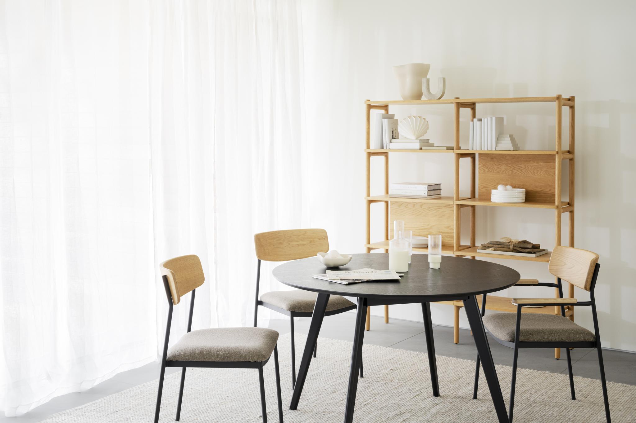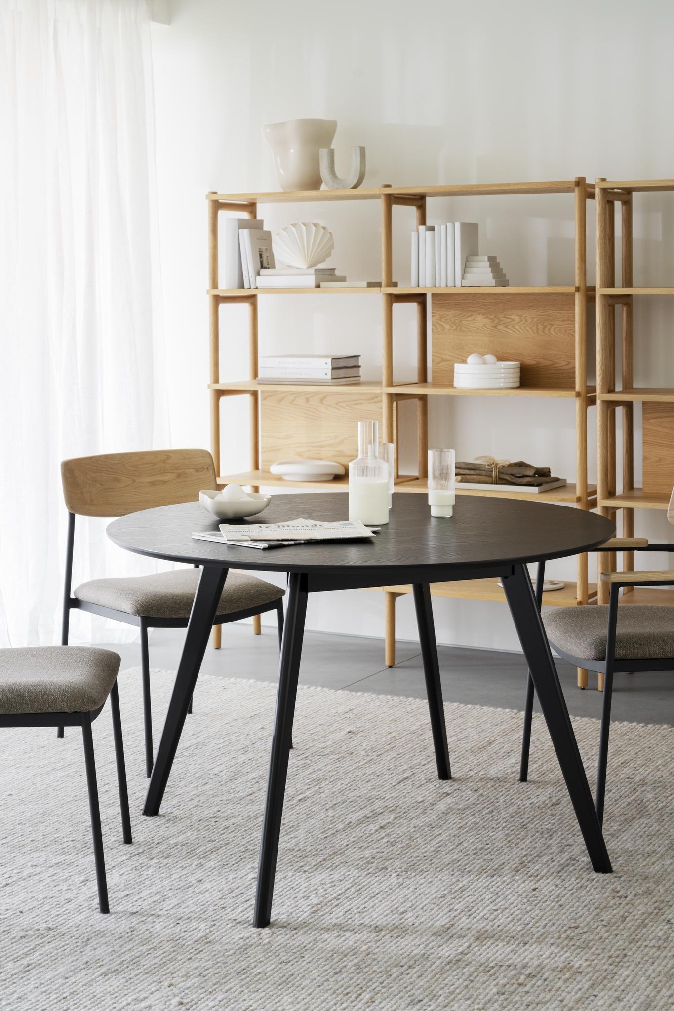 • Runt matbord i svart trä med matchande stolar och ljus bokhylla i ek i skandinavisk matsal