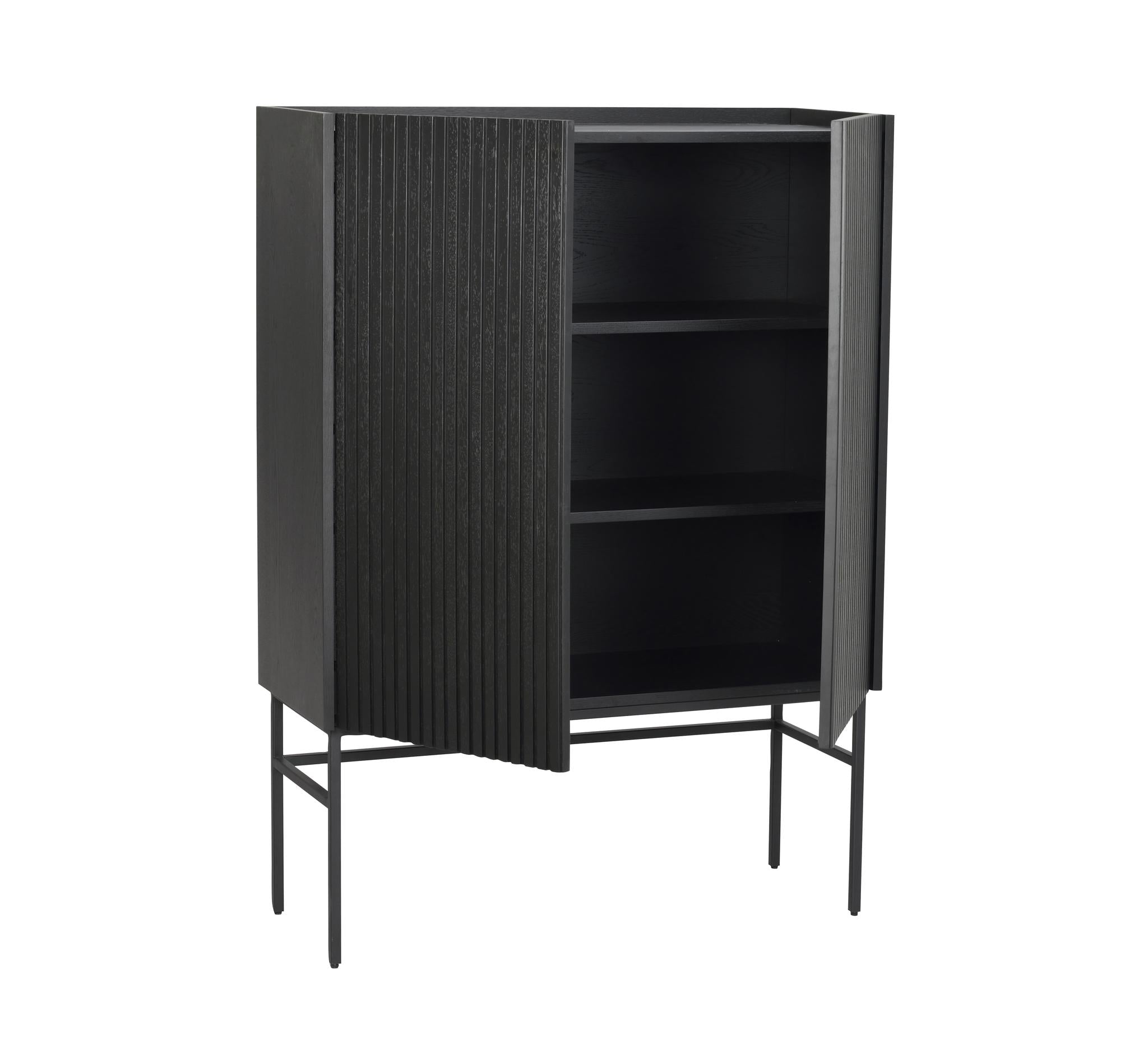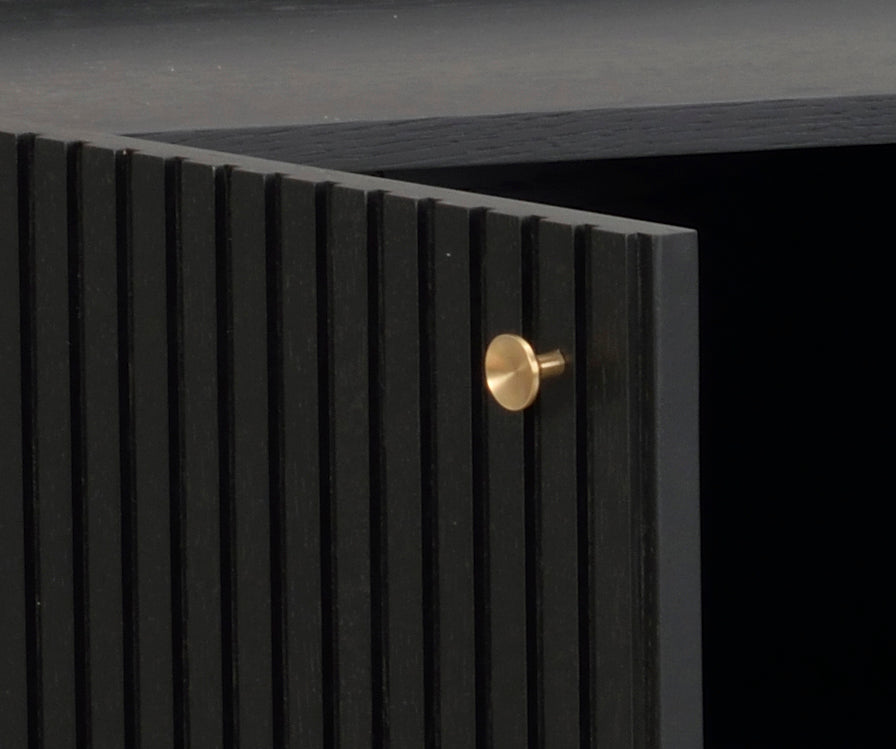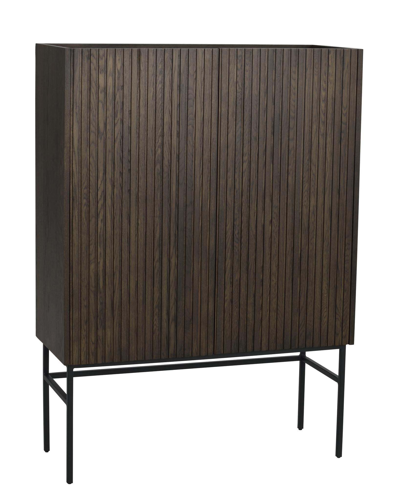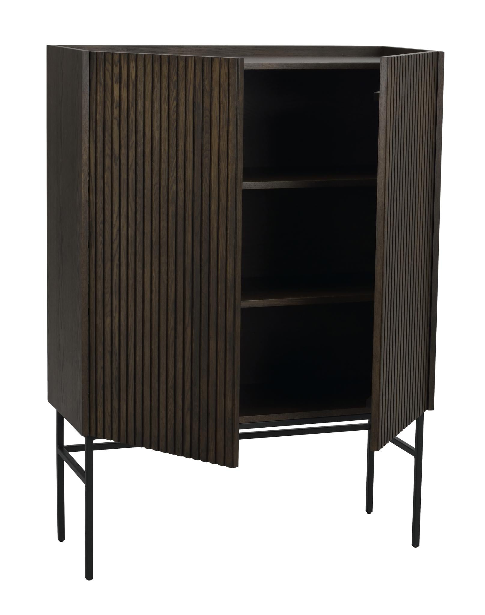 Trendiga Halifax skåp i brunlackad ek med svarta metallben i rak elegant profil. Ytan består av massiva ekribbor på faner och har två praktiska hyllplan, varav ett är justerbart. Knoppar i guldfärgad borstad metall medföljer och du väljer själv om du vill sätta dit dem eller ha utan. Dörrarna har mjukstängande soft-close funktion.