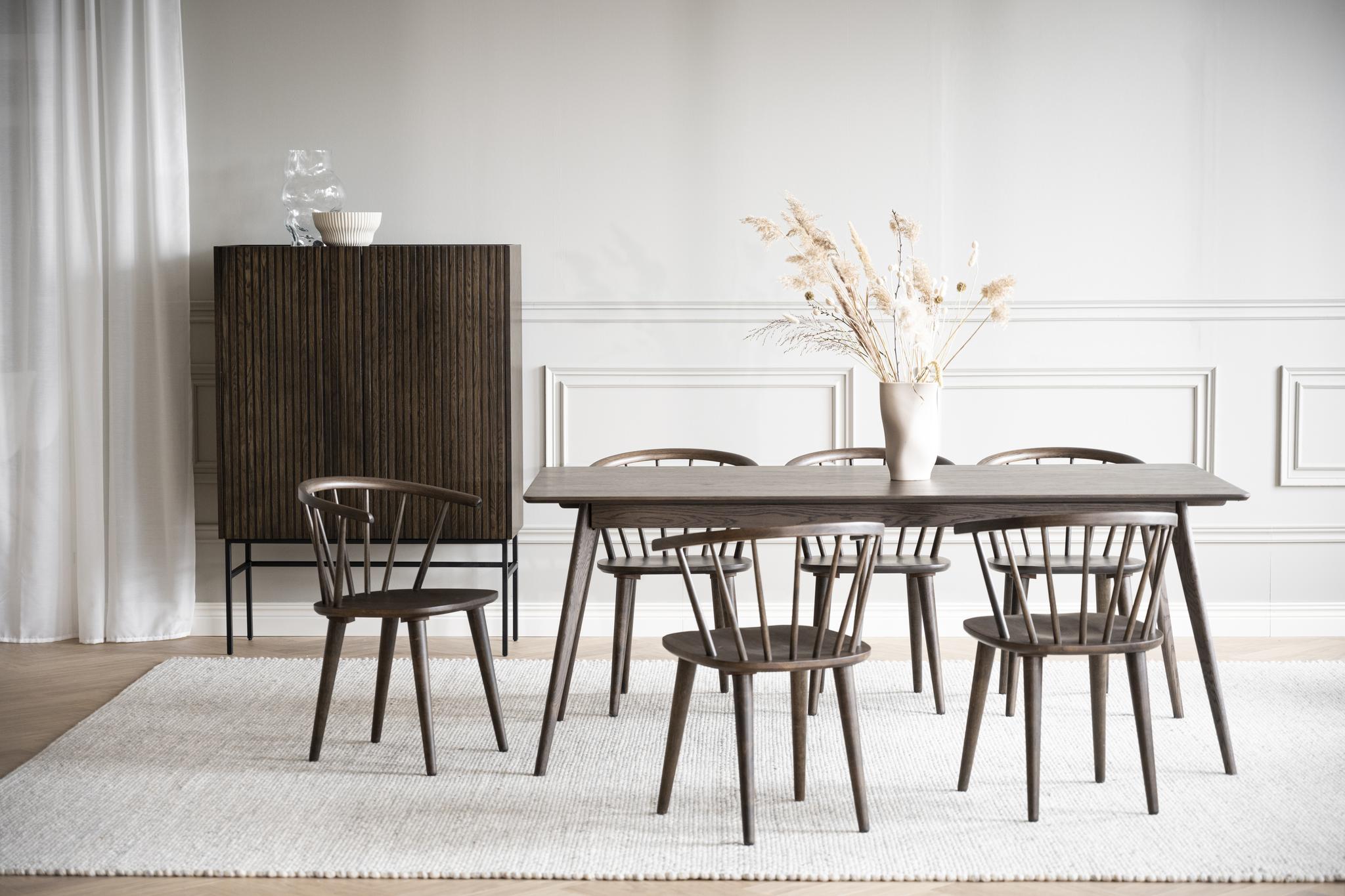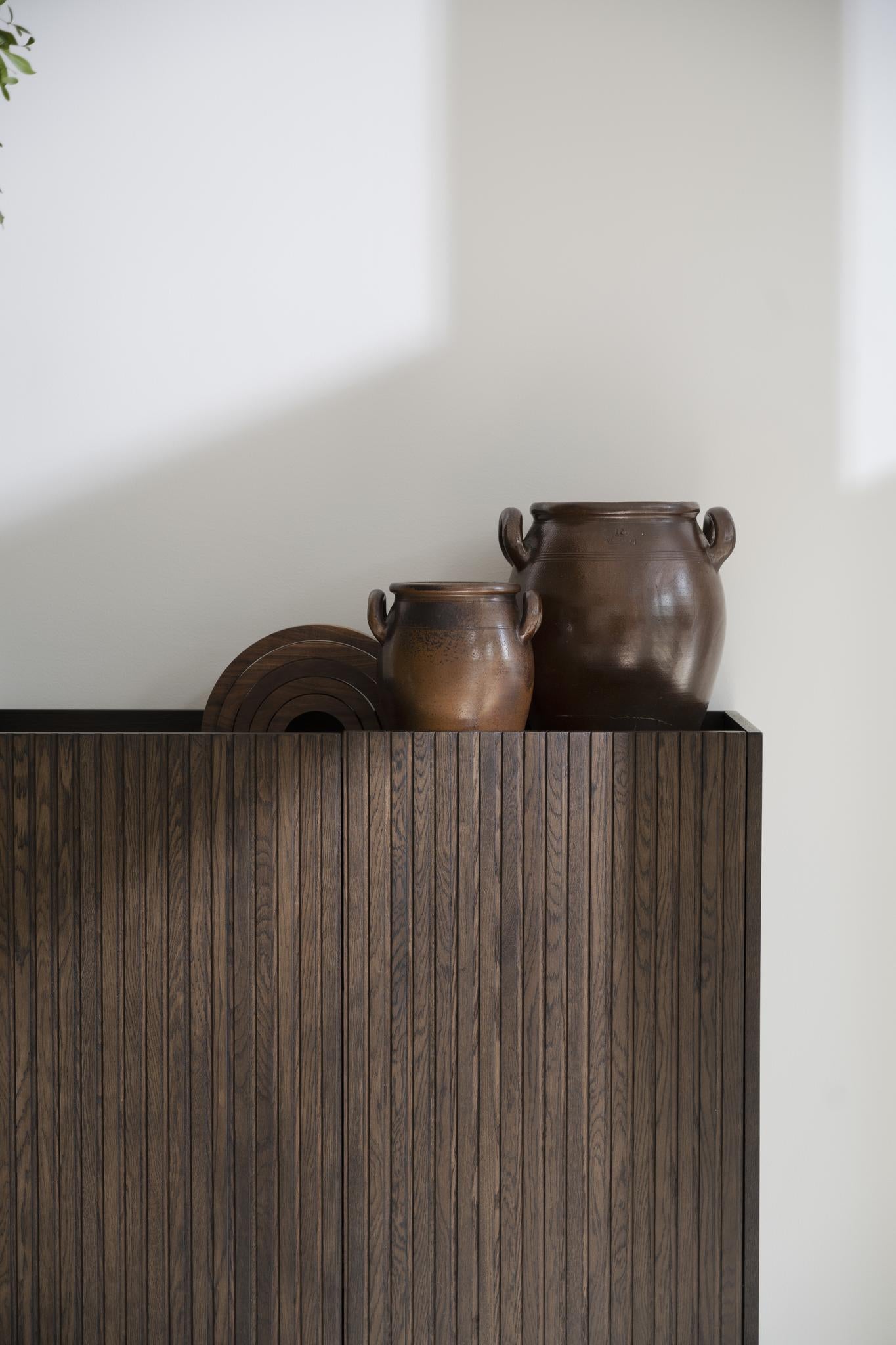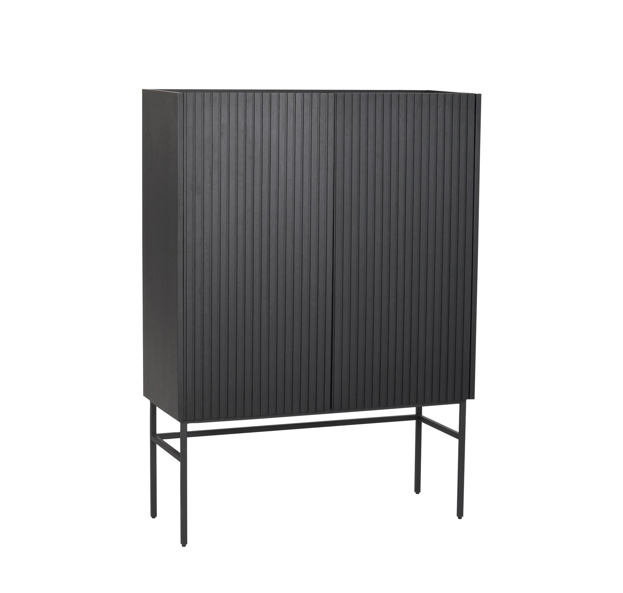 Trendiga Halifax skåp i brunlackad ek med svarta metallben i rak elegant profil. Ytan består av massiva ekribbor på faner och har två praktiska hyllplan, varav ett är justerbart. Knoppar i guldfärgad borstad metall medföljer och du väljer själv om du vill sätta dit dem eller ha utan. Dörrarna har mjukstängande soft-close funktion.