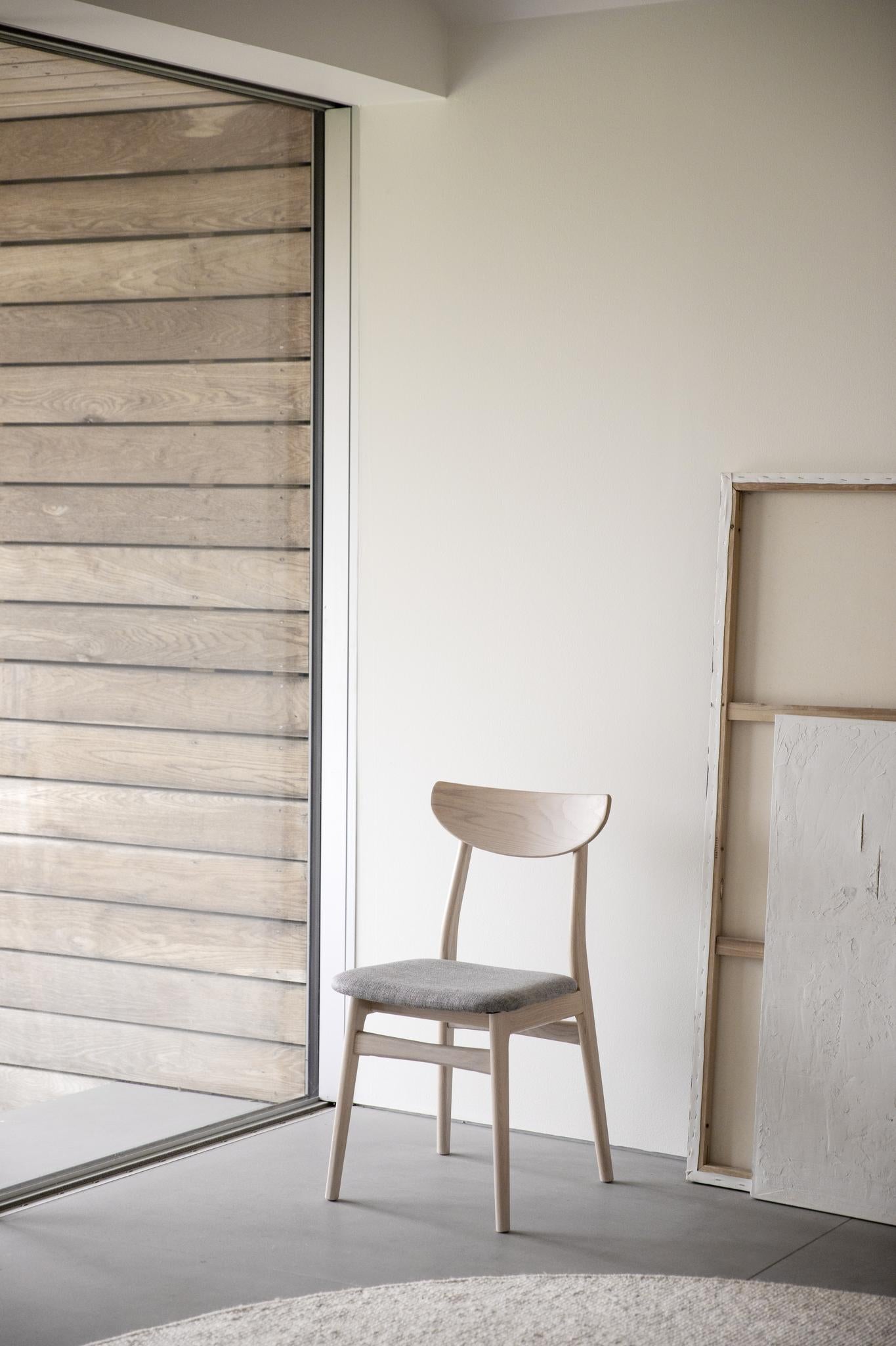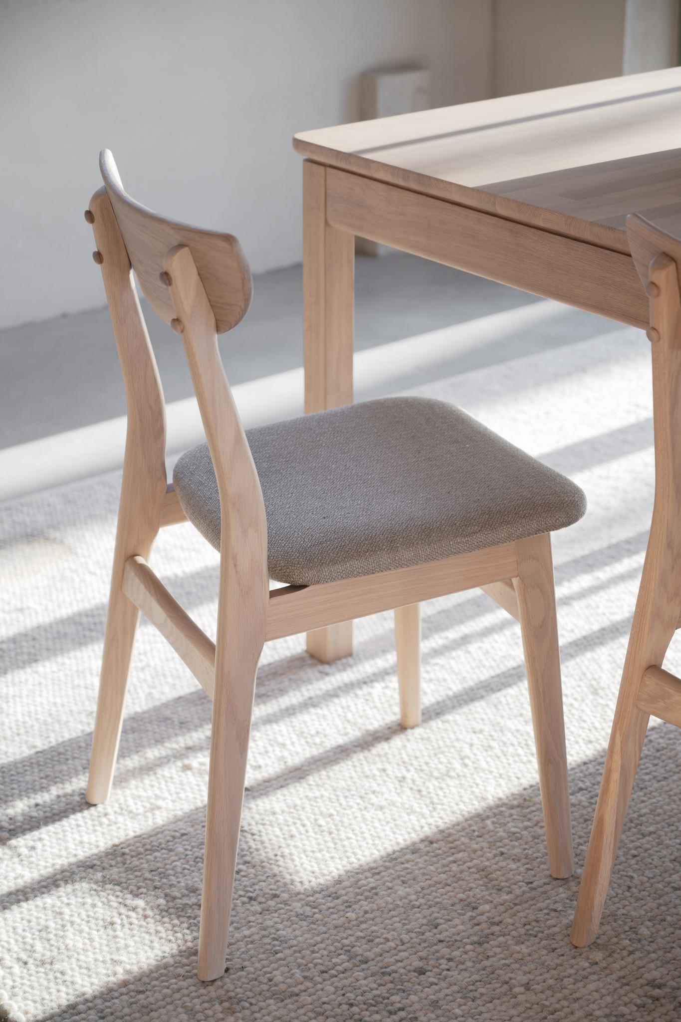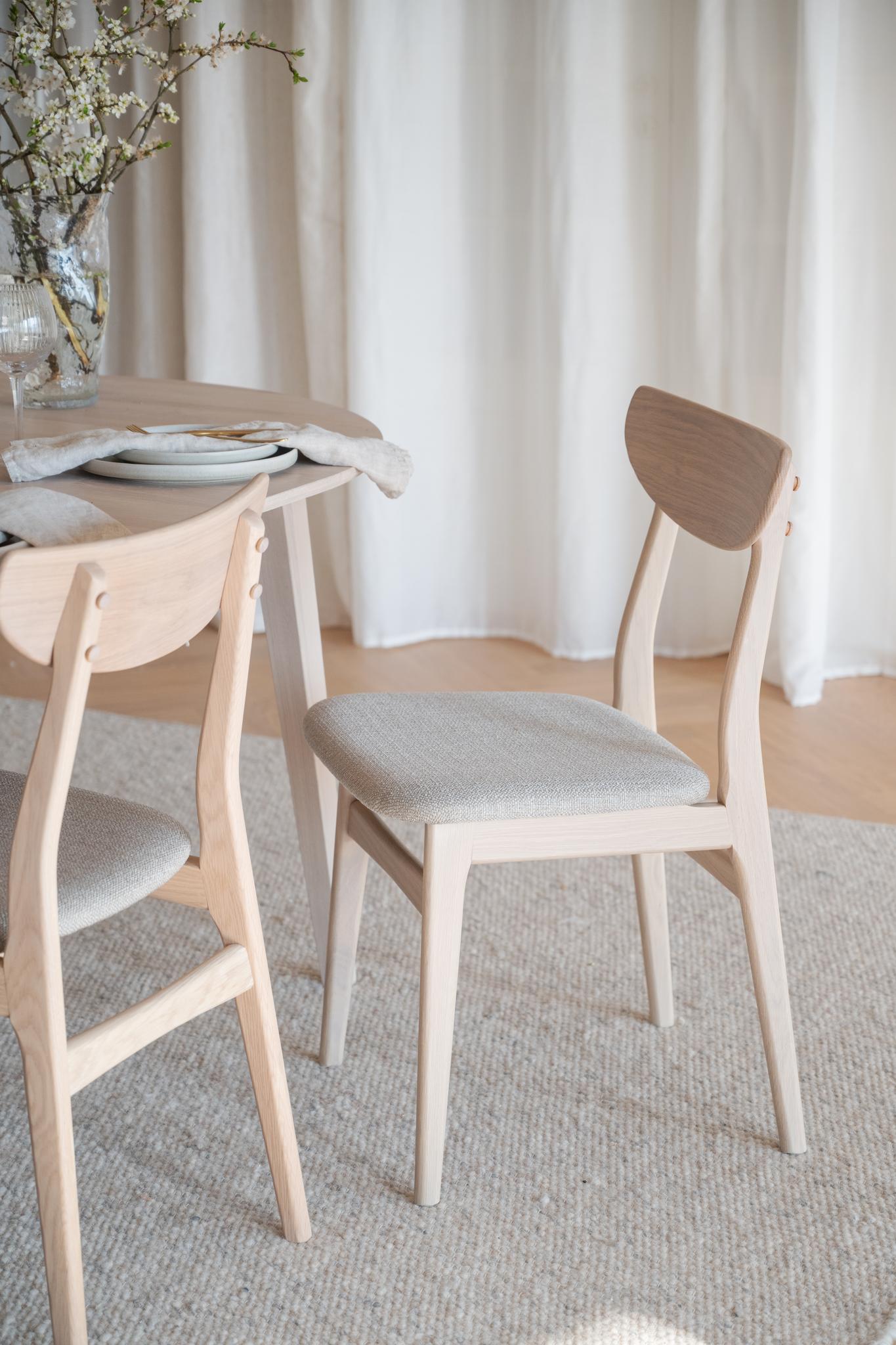 Rodham stol i vitpigmenterad ek med gråbeige sits är både trendsäker och exklusiv i sitt uttryck. Stolen består av massiv ek i både stomme och ryggbricka. Den klädda sitsen är både bekväm och elegant. Finns också i flera naturnära färger.