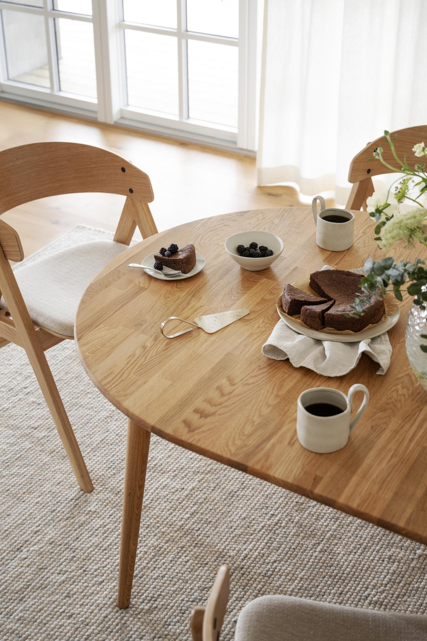 • Runt matbord i ek med stolar och chokladkaka, kaffekoppar och blåbär i ljust skandinaviskt kök
