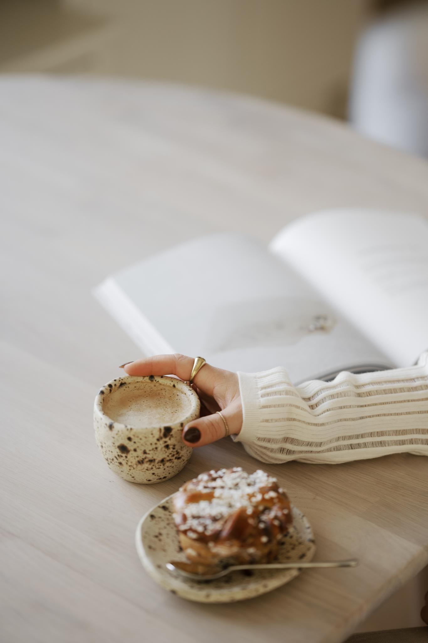• Hand som håller en spräcklig keramikmugg med kaffe vid bord med semla på matchande tallrik