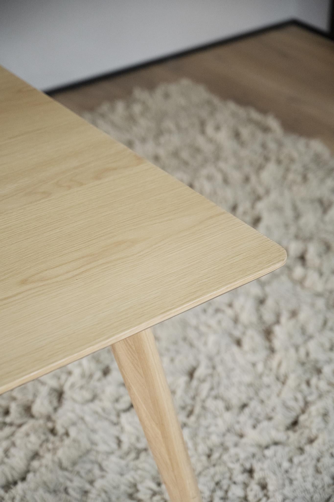 • Närbild på ljust träbord med synlig trästruktur och ben, placerat på grå luggmatta i modern inredning