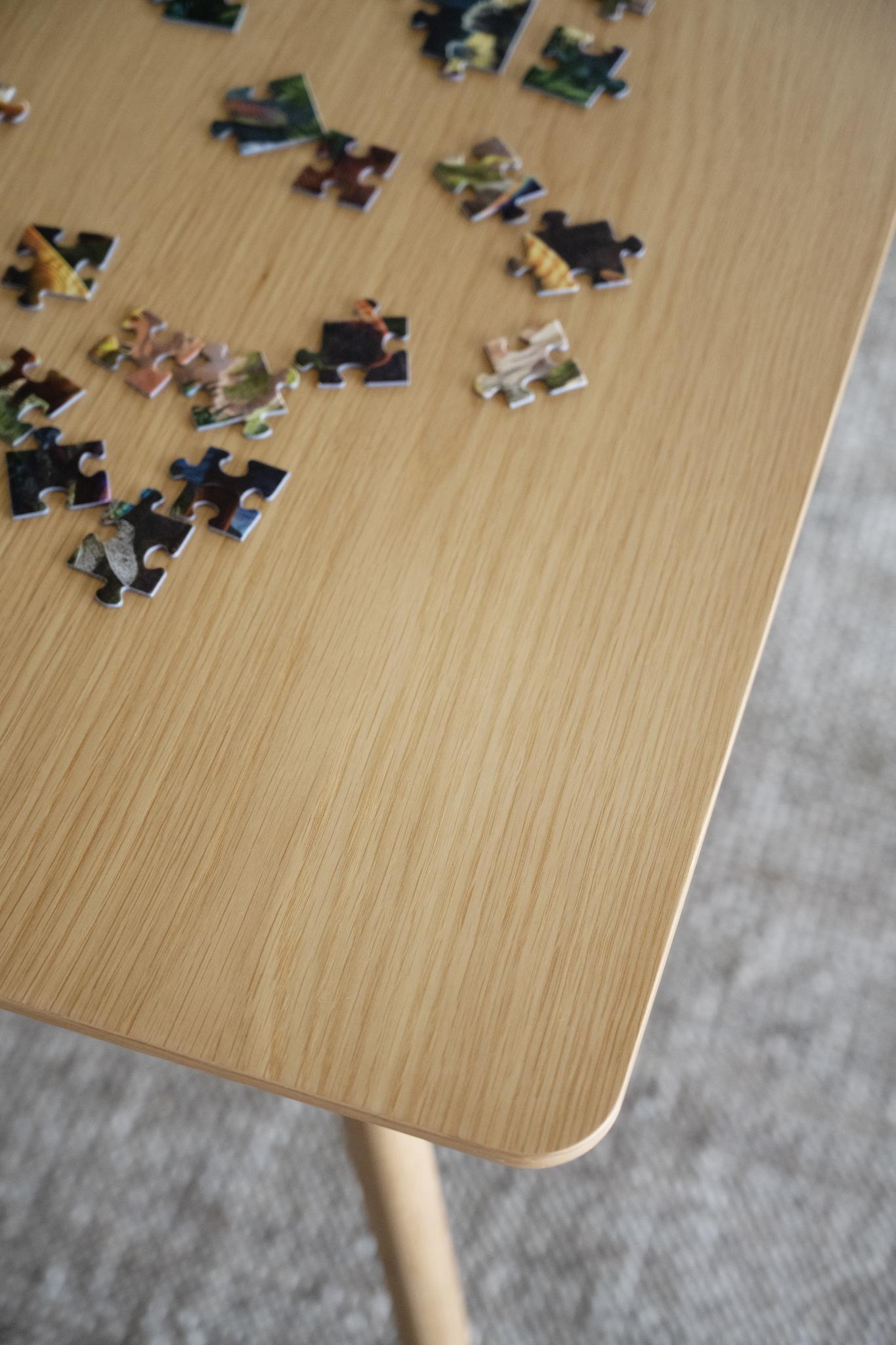 • Pusselbitarna ligger utspridda på träbord med ekfanér och rundade hörn