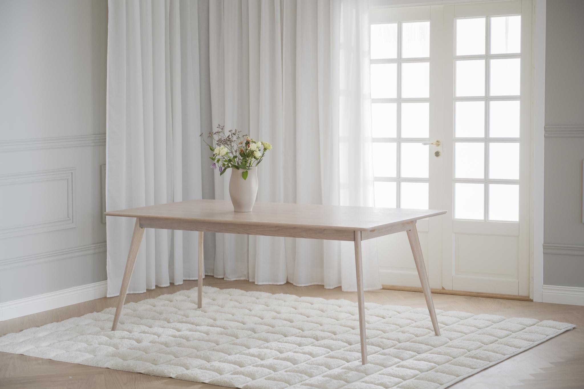 • Ljust matbord i trä med sneda ben på vit quiltad matta framför fönsterdörr med vita gardiner
