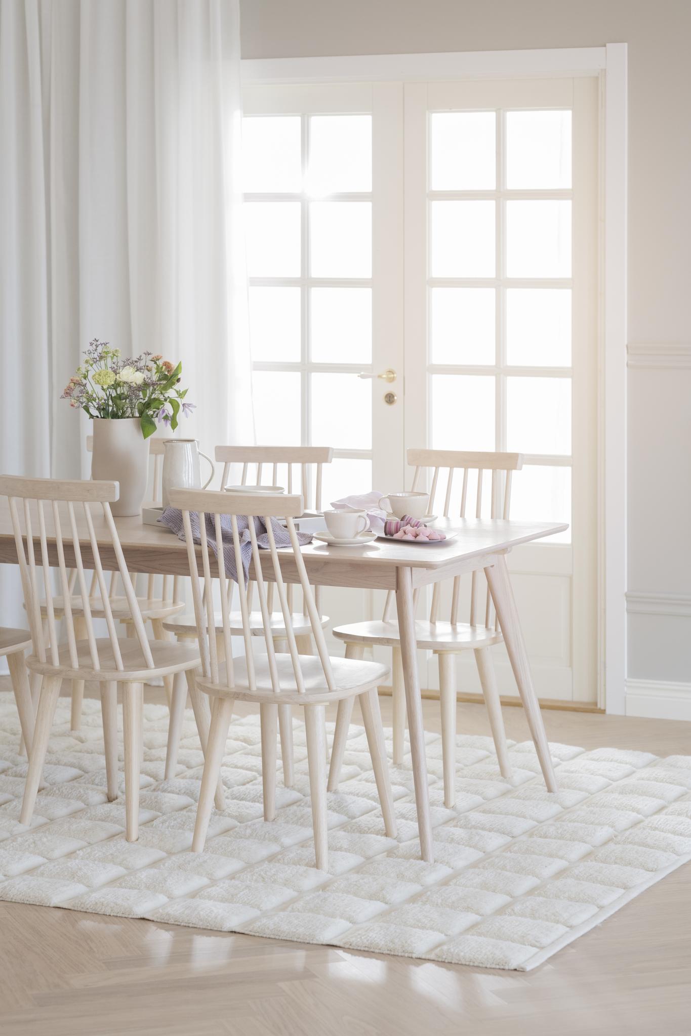 • Ljus matplats med ljust trämöblemang, spjälstolar runt matbord på vit matta framför glasdörr